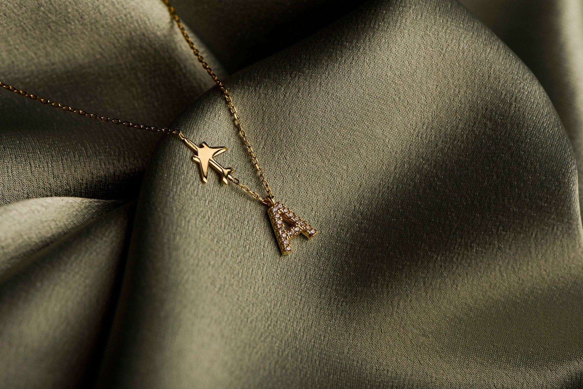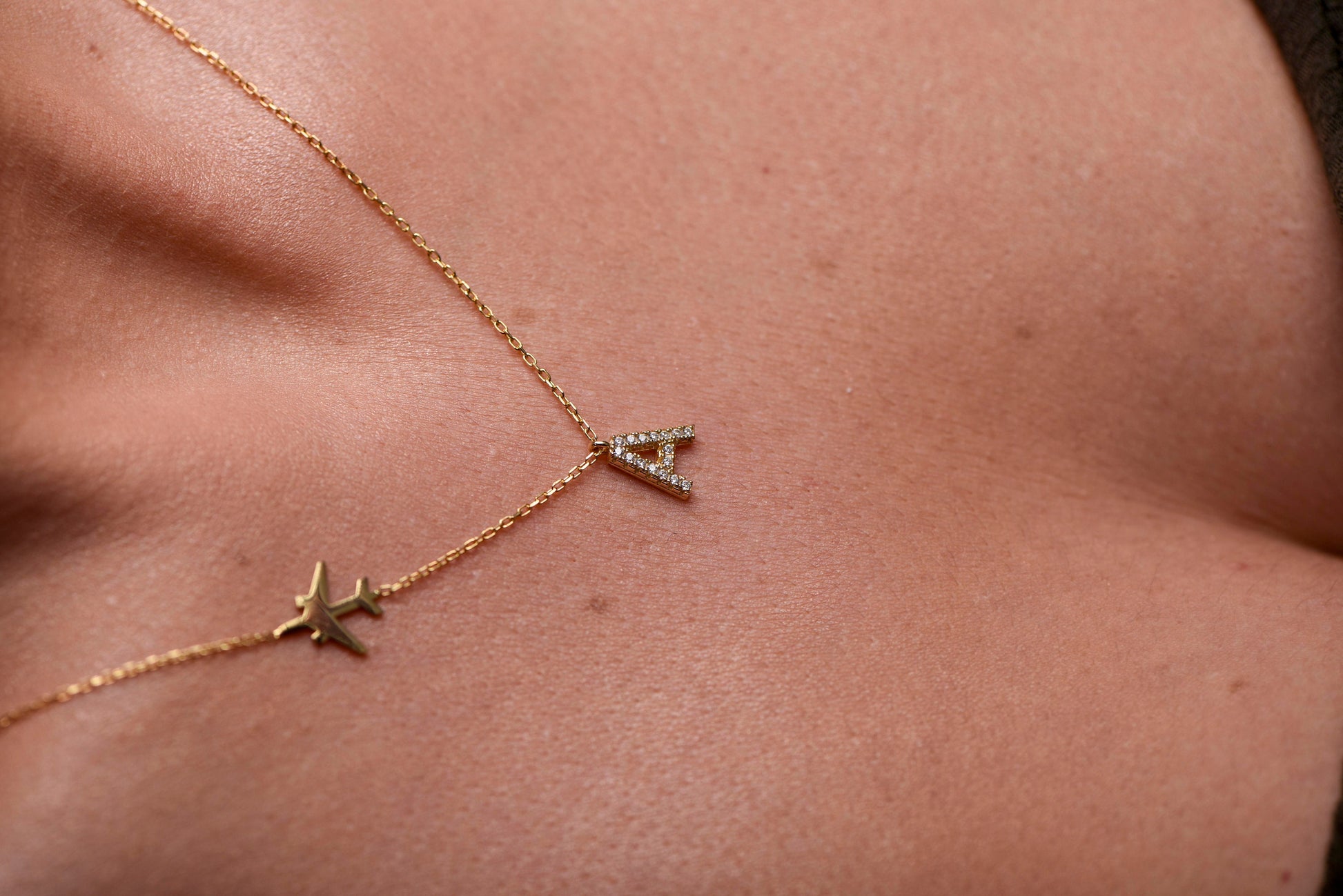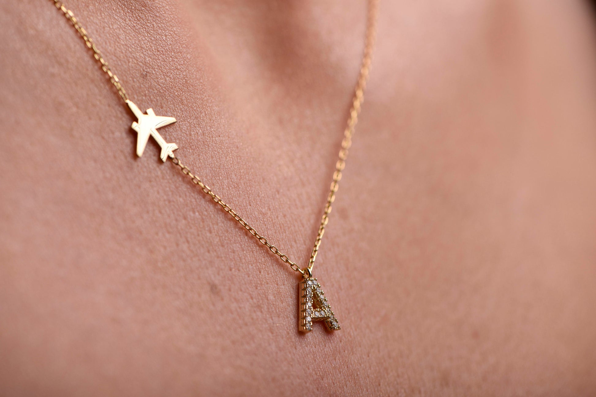 14K Gold Letter Airplane Necklace/Diamond Letter Necklace/Gold Aircraft Necklace/Personalized Letter Necklace/Gift For Mom