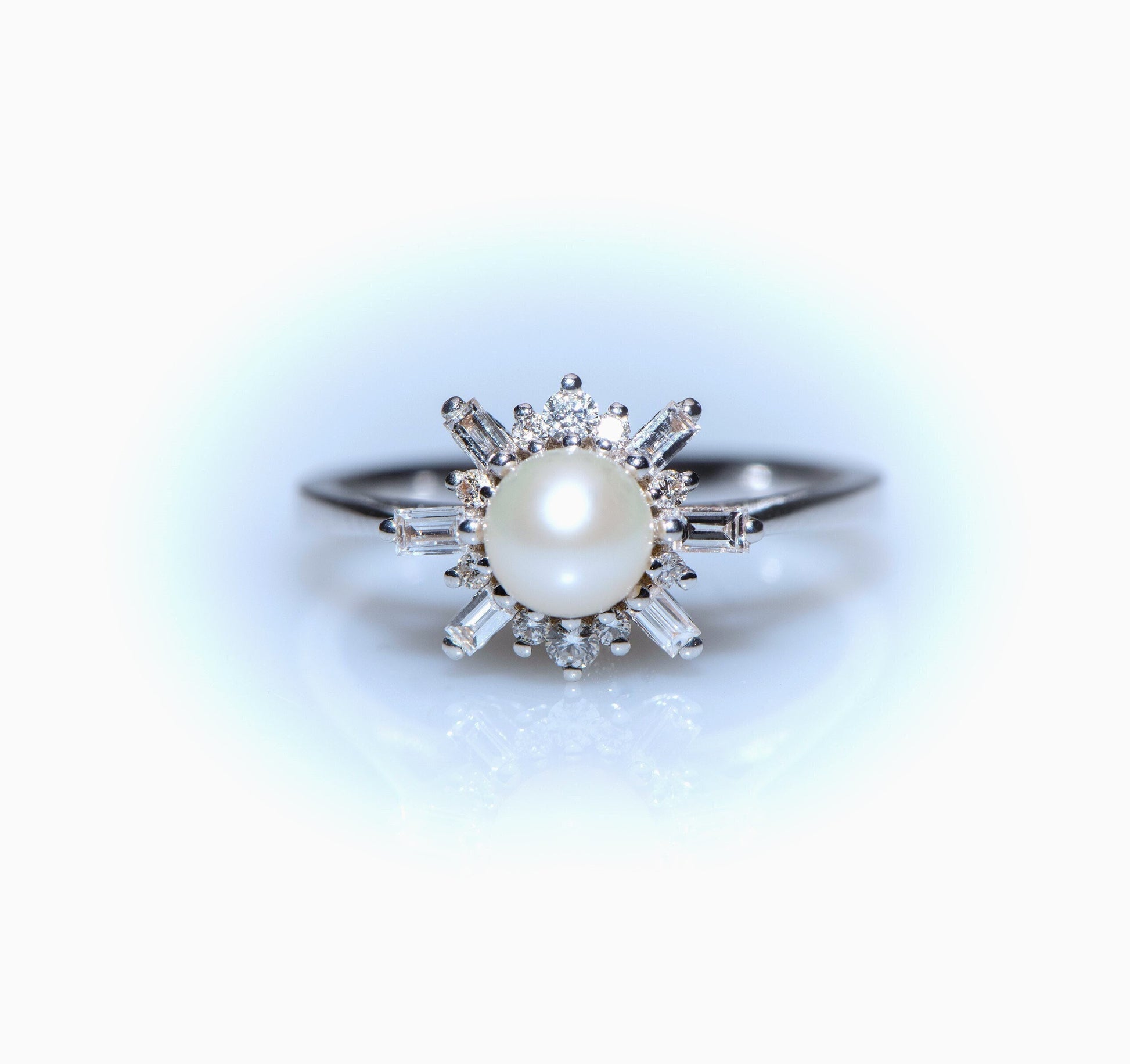 Celebrate love, commitment, and eternal grace with this breathtaking 14K solid gold ring. At its heart lies a luminous 5.5mm natural pearl, embraced by a radiant halo of baguette and round cut diamonds that create a sunburst-inspired design.