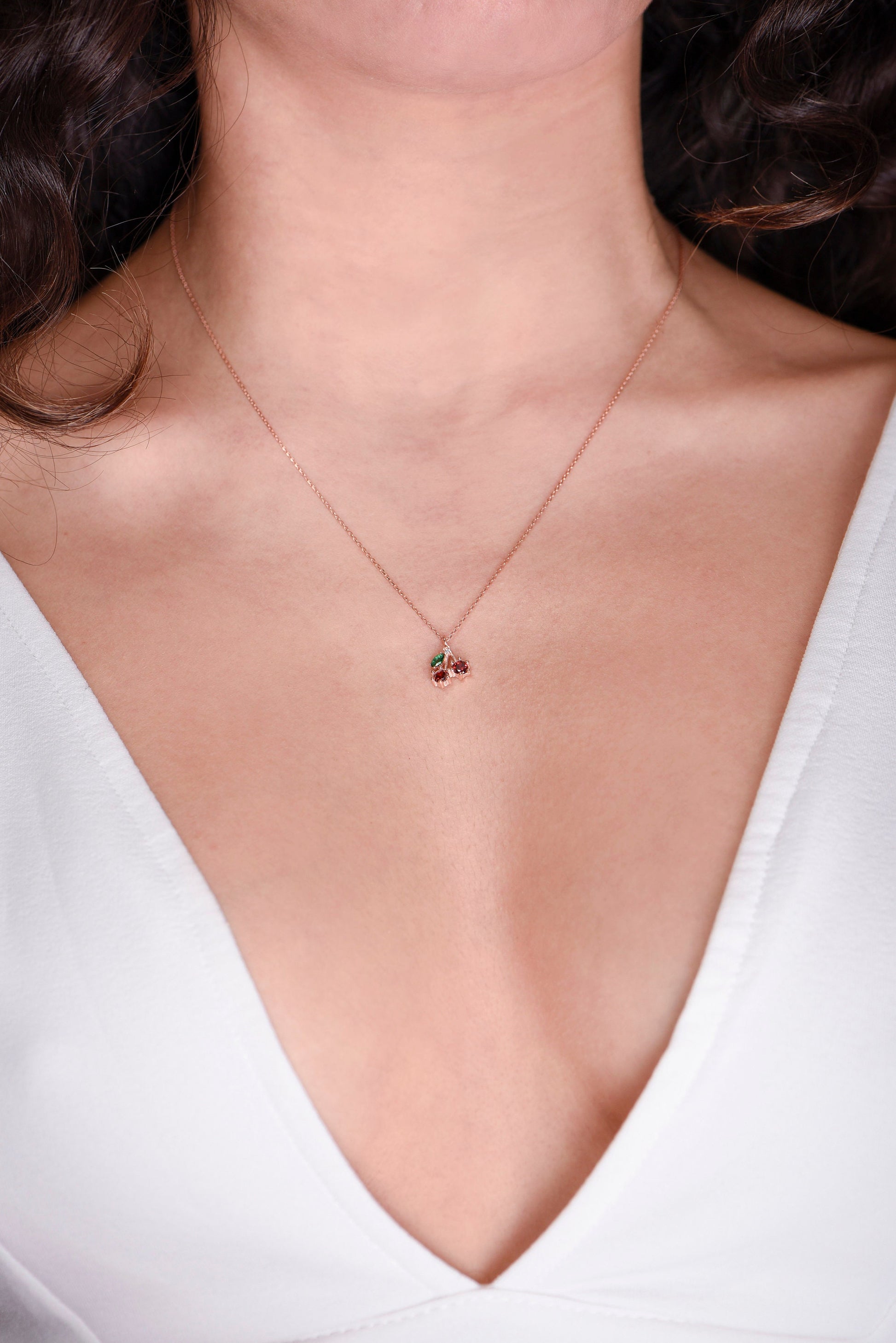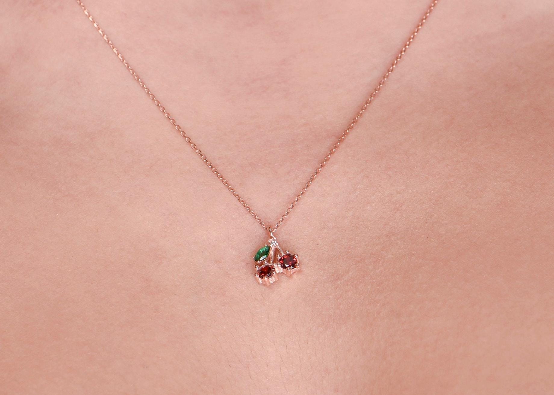 14K Rose Gold Cherry Necklace - Garnet, Emerald, and Diamond Pendant, Dainty Fine Jewelry Gift