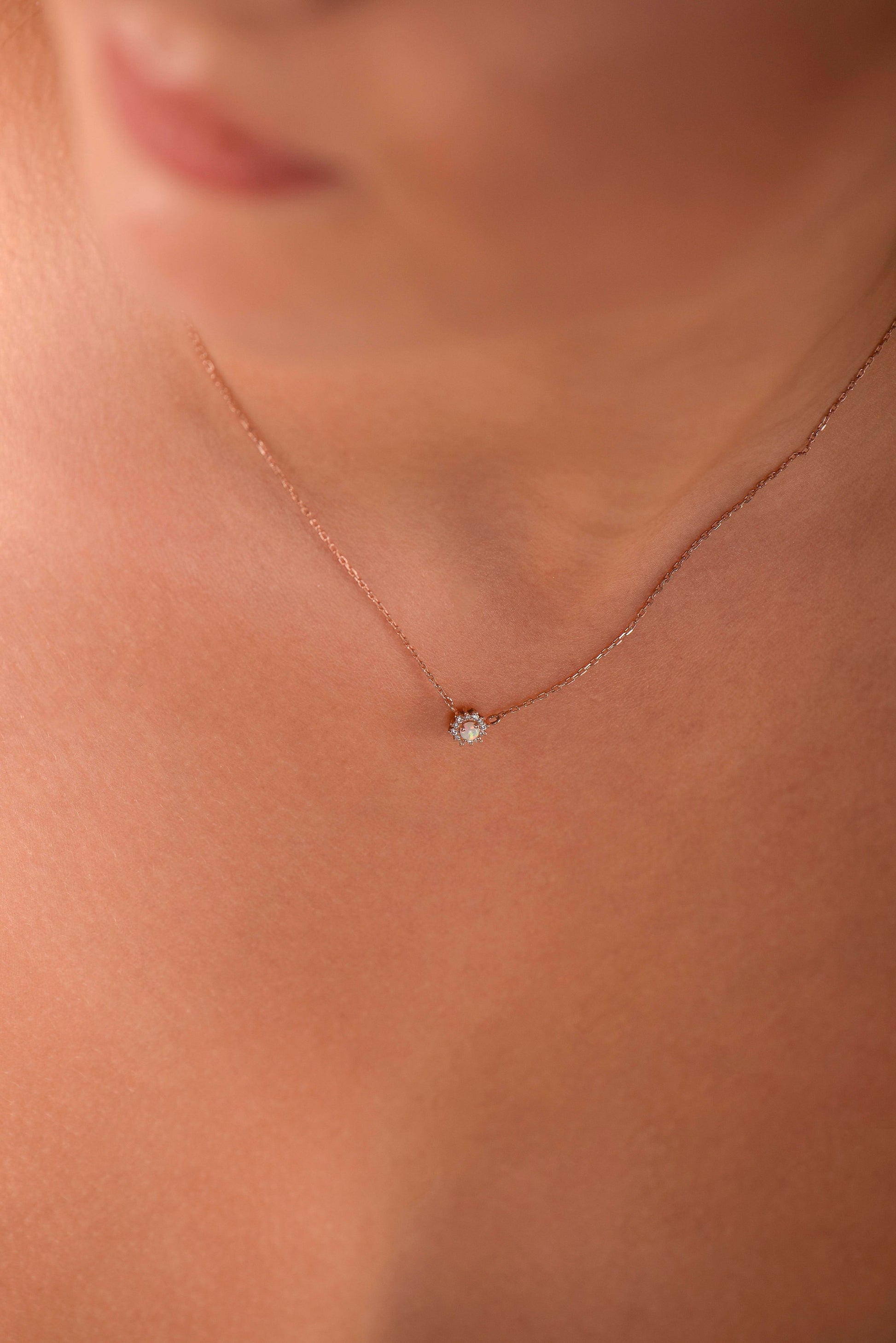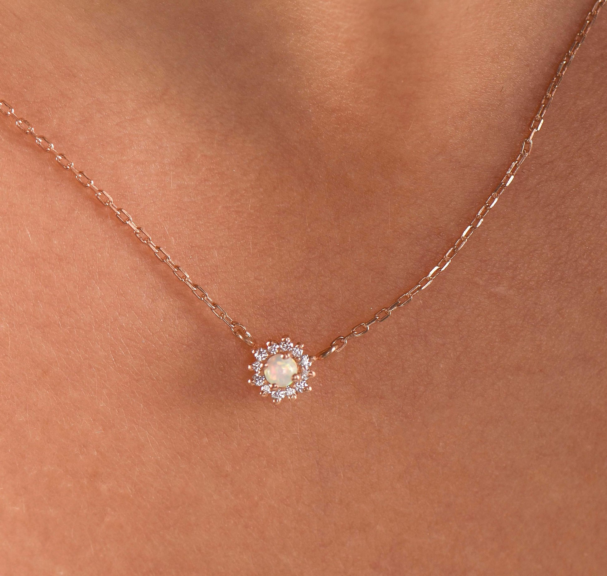 14K Rose Gold Opal and Diamond Halo Necklace - Dainty October Birthstone Pendant Gift for Her