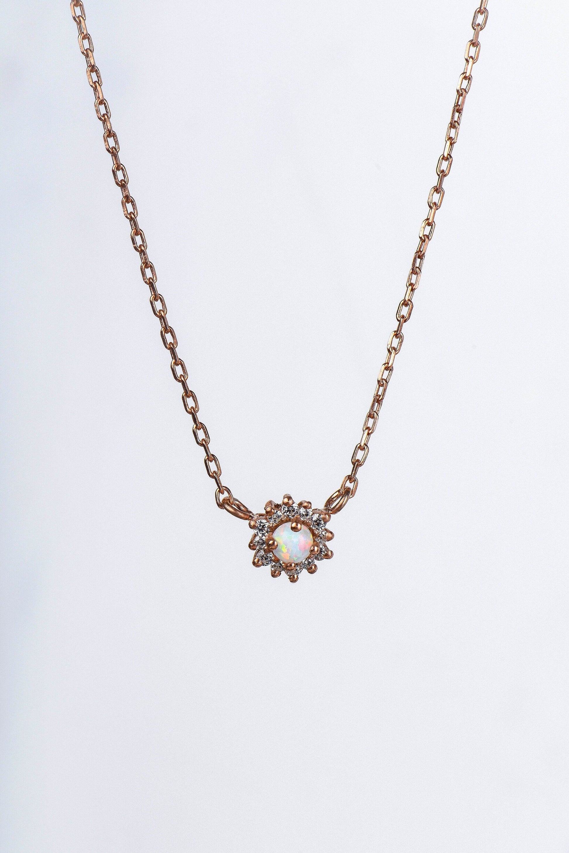 🌟 Radiating with ethereal charm, this 14K rose gold necklace showcases a luminous natural opal (3mm, 0.10ct) encircled by a sparkling halo of 12 brilliant round-cut natural diamonds (1.30mm & 1.00mm, total 0.06ct, VS-SI clarity, white color).