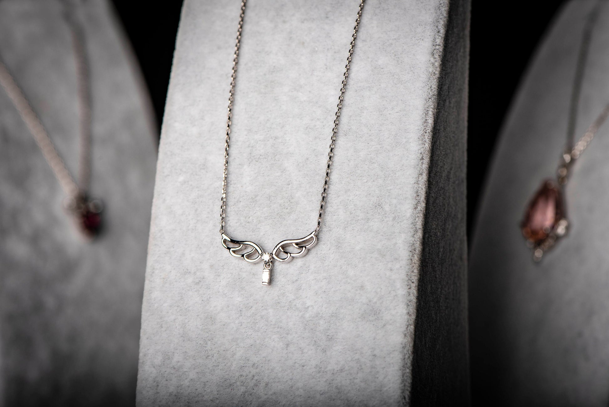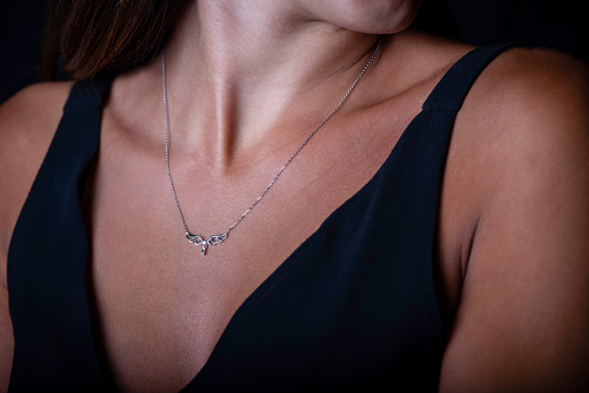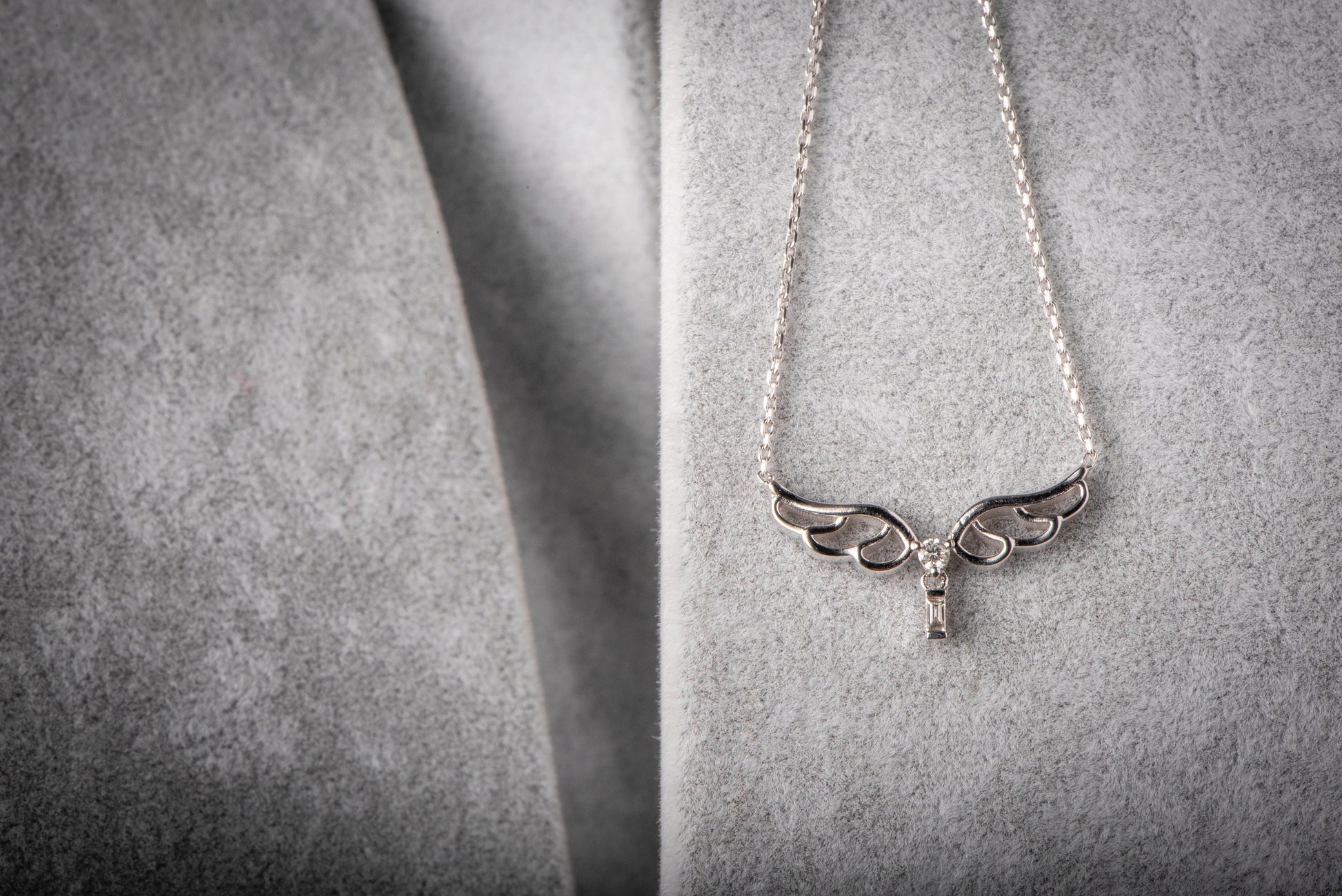 Introducing our elegant and sophisticated white solid gold angel wing necklace. This exquisite piece is sure to make a statement with its stunning design and intricate details. The angel wing pendant is crafted from high-quality white solid gold, giving it a radiant and timeless look. Adorned with baguette diamonds, this necklace adds a touch of sparkle and glamour to any outfit, making it perfect for special occasions or everyday wear. With its delicate chain and adjustable length, this necklace is comfortable to wear and easy to style. A perfect gift for yourself or a loved one, this white solid gold angel wing necklace is a true symbol of beauty and grace.