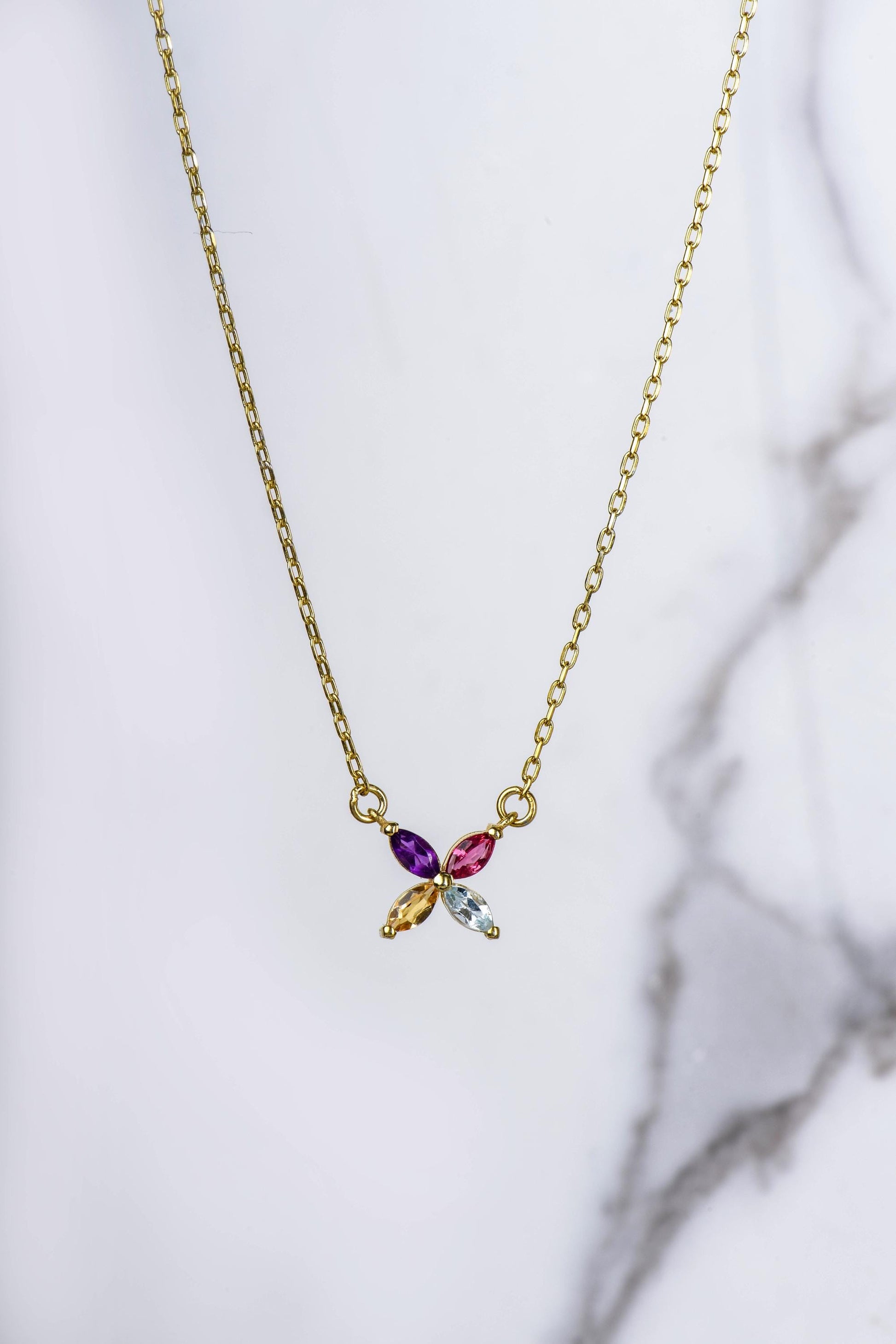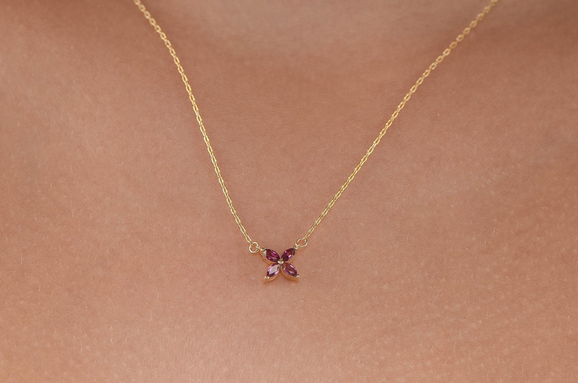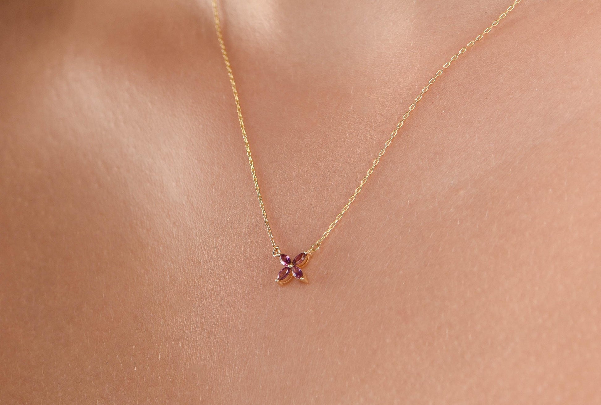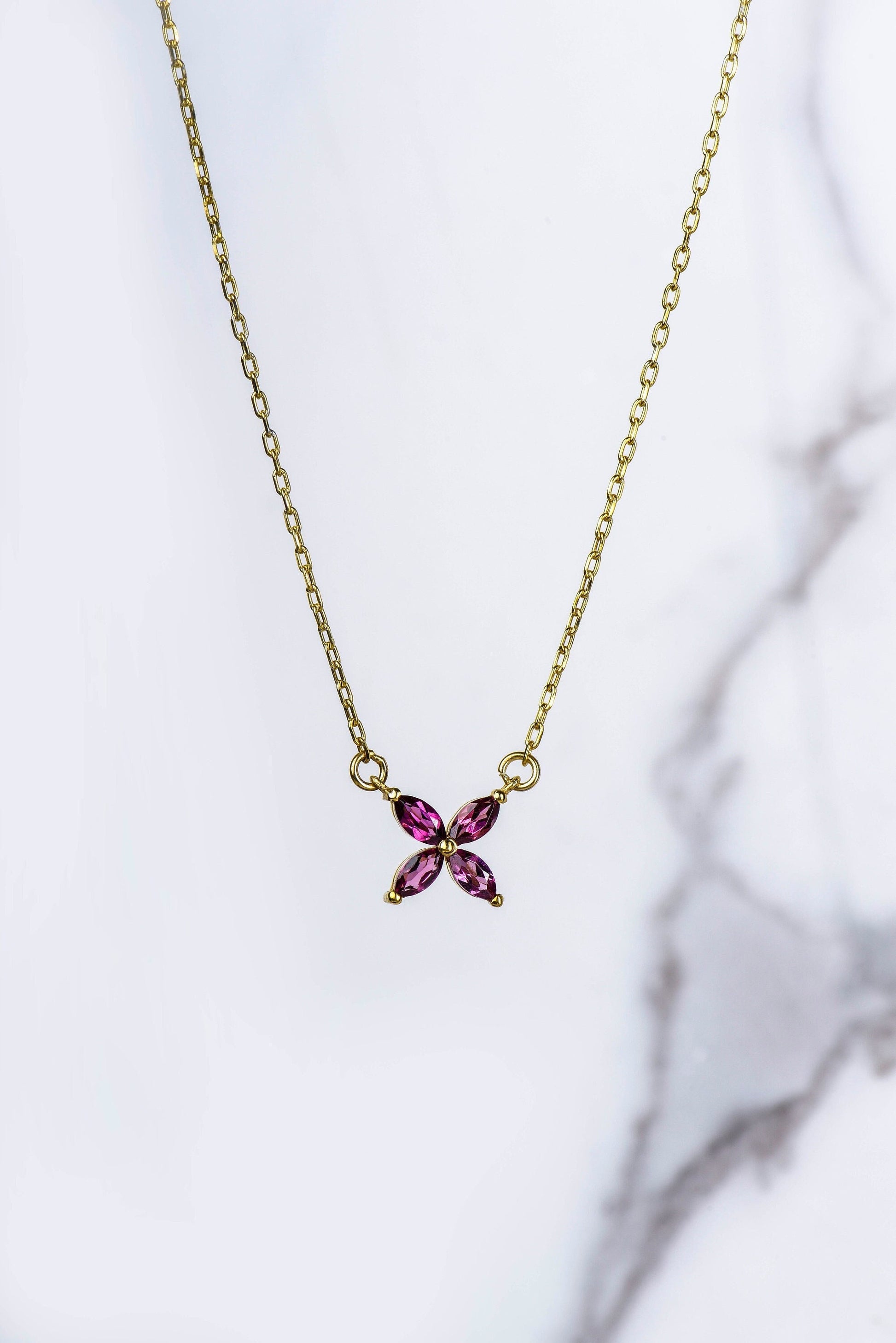 🌸 Add a touch of floral elegance with this handcrafted 14K yellow gold necklace, featuring four marquise-cut amethyst gemstones (4x2mm each) arranged in a charming flower design. With a total of 0.40ct, this pendant radiates beauty and femininity.