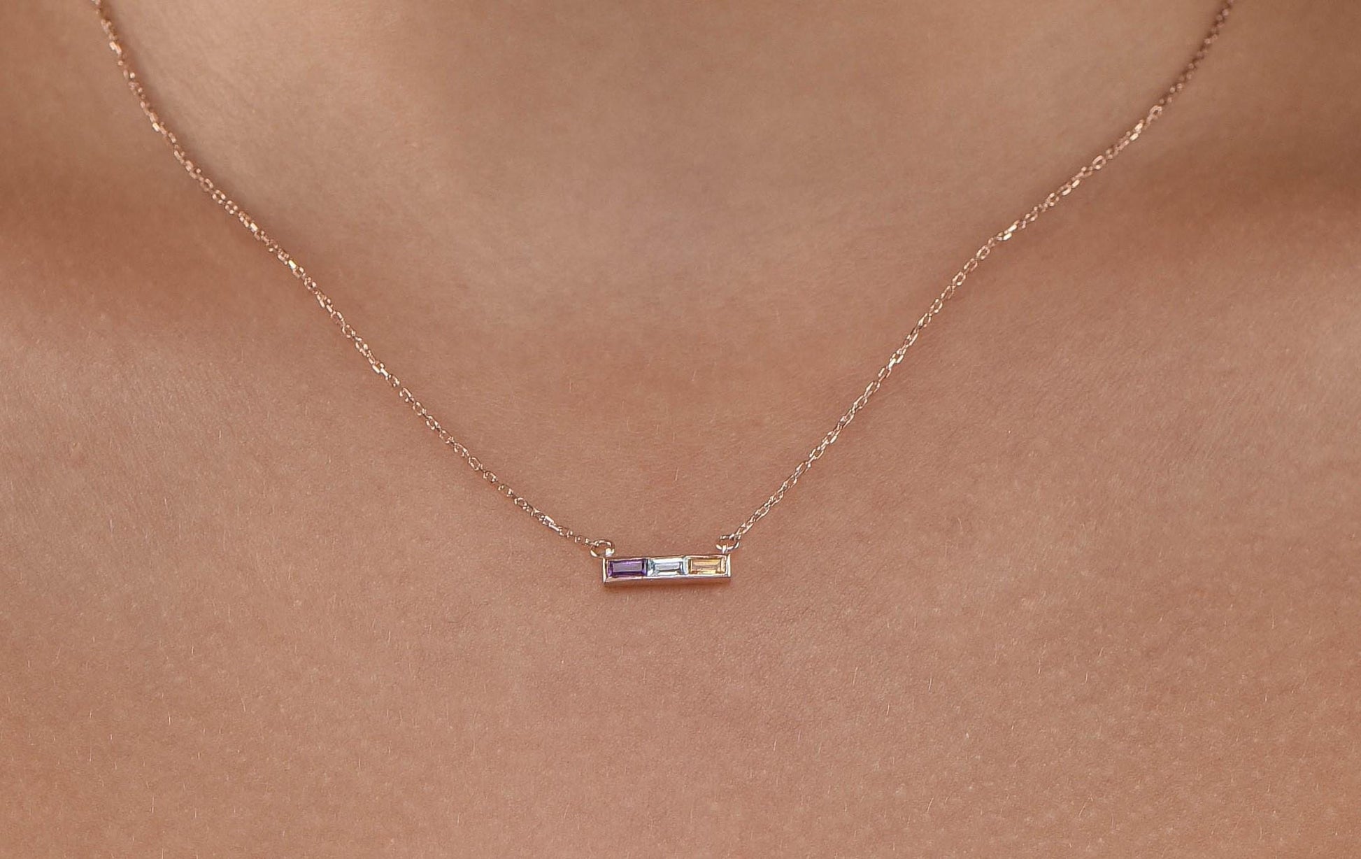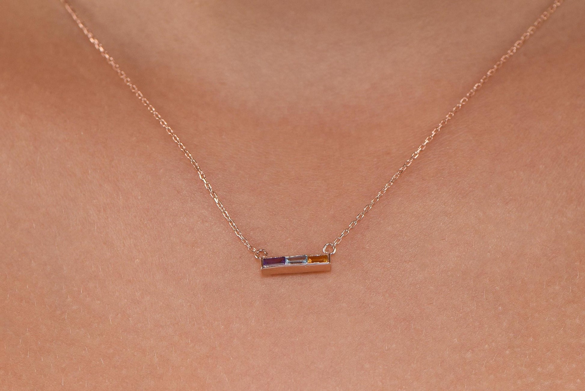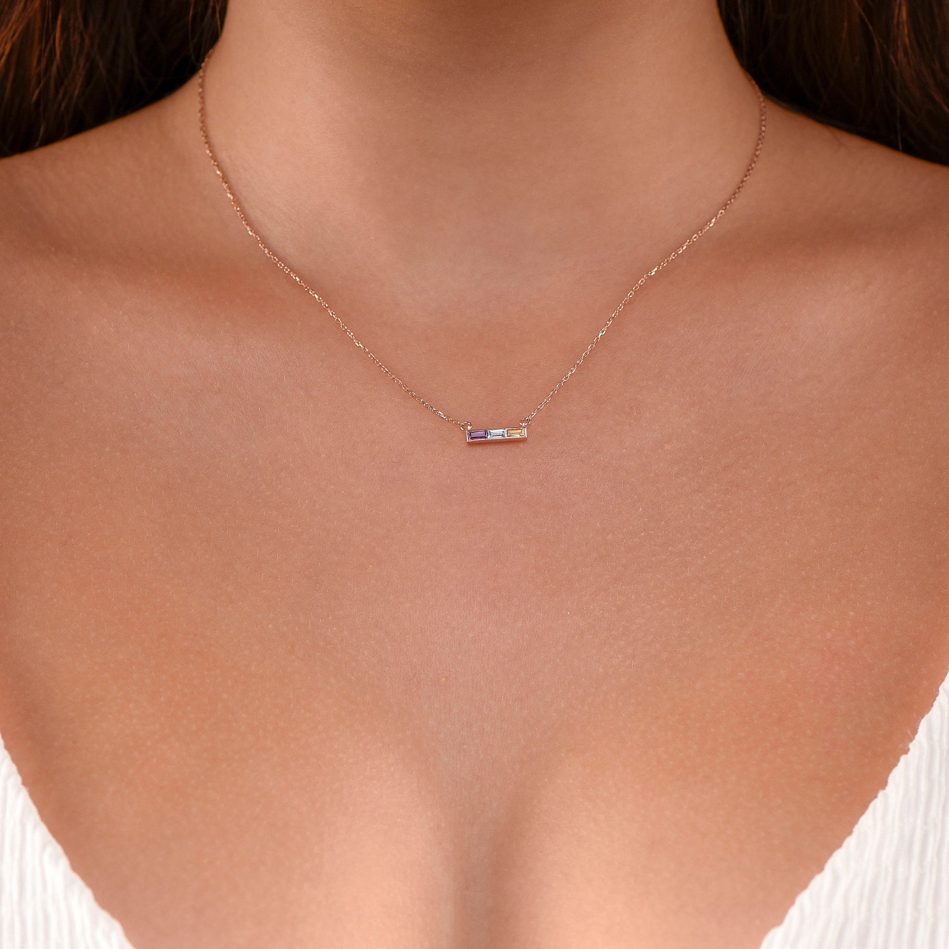 🌟 A fresh and colorful take on minimalist design, this 14K solid yellow gold necklace showcases a sleek horizontal bar pendant with three baguette-cut gemstones: amethyst (purple), aquamarine (blue), and citrine (yellow). Each stone measures 4x2mm and weighs 0.10ct, creating a bold and balanced look.