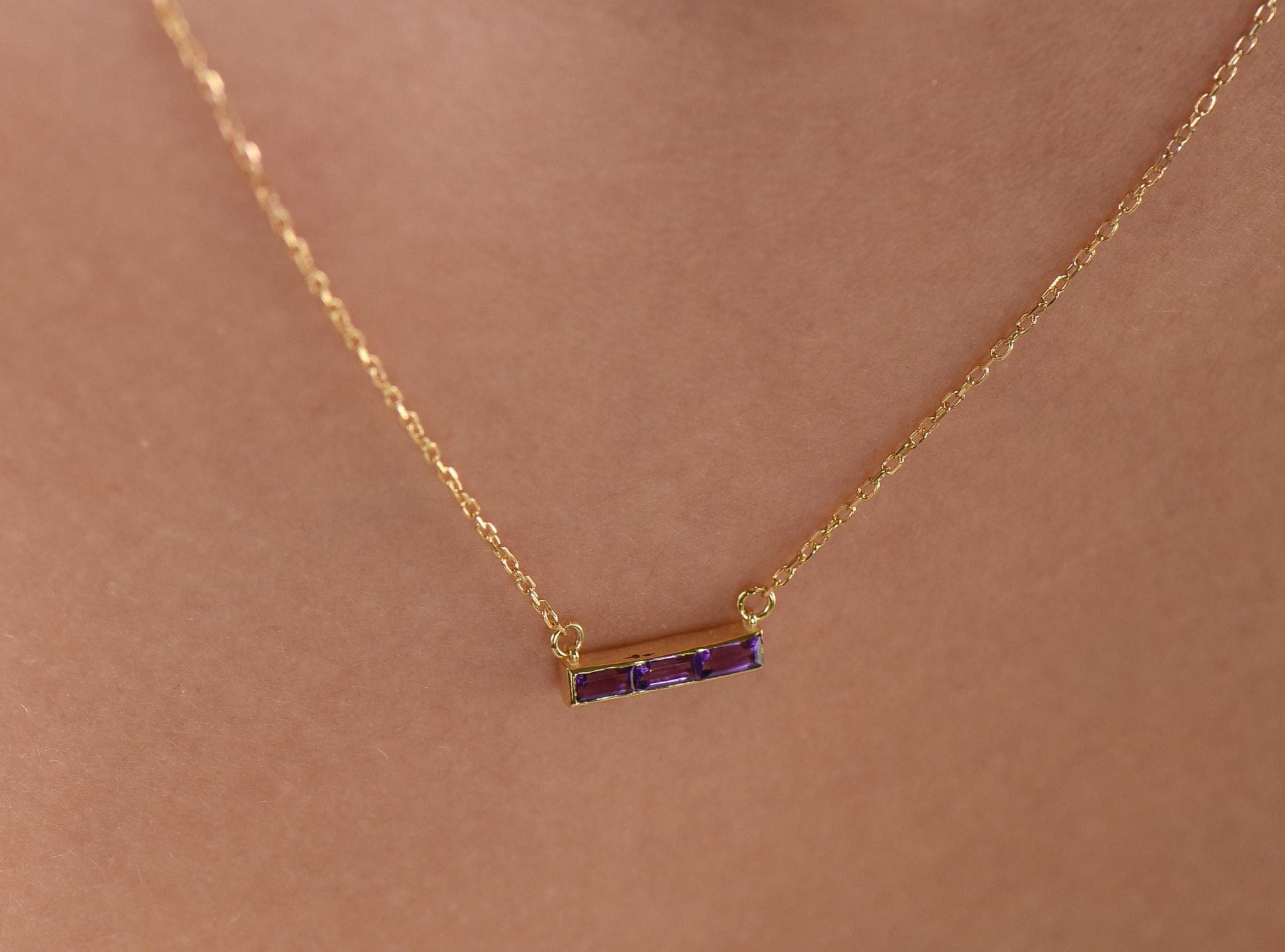 14K Yellow Gold Baguette Amethyst Bar Necklace - Dainty Purple Gemstone Pendant for Her