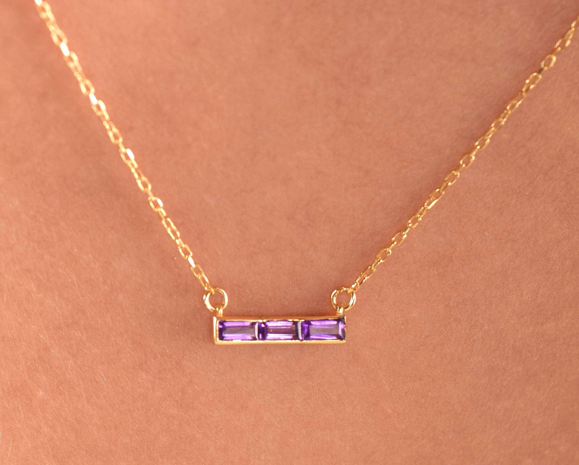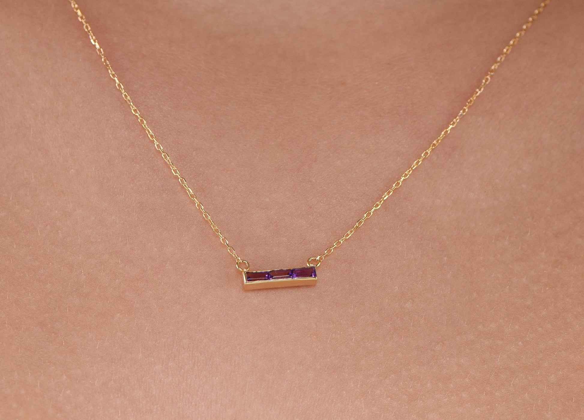 🌟 This classic yet modern necklace features three baguette-cut amethyst gemstones (4x2mm each) totaling 0.30ct, set horizontally in a 14K solid yellow gold bar design. The vibrant purple stones make it a perfect statement of style and elegance.