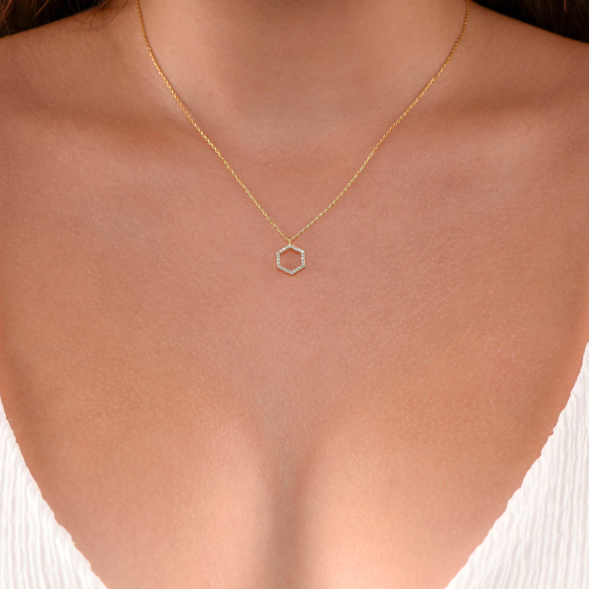 14K Yellow Gold Hexagon Diamond Necklace - Geometric Minimalist Pendant Gift for Her