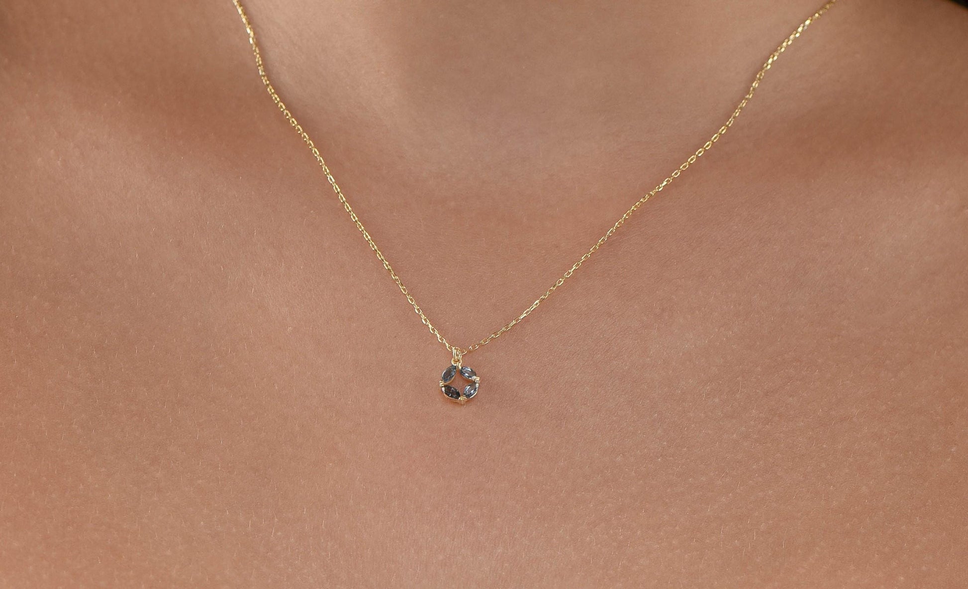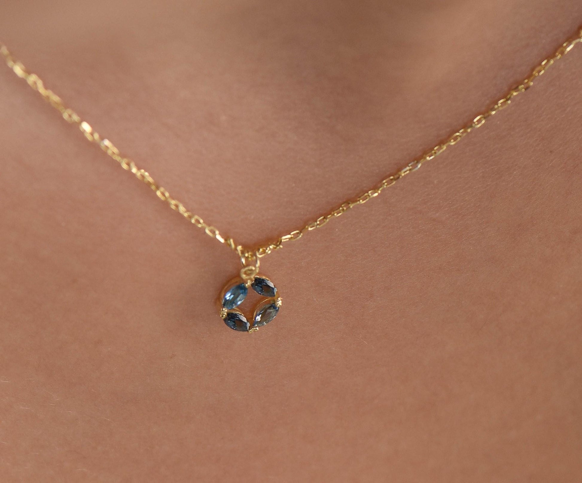 14K Yellow Gold London Blue Topaz Circle Necklace - Marquise Cut Gemstone Pendant for Her