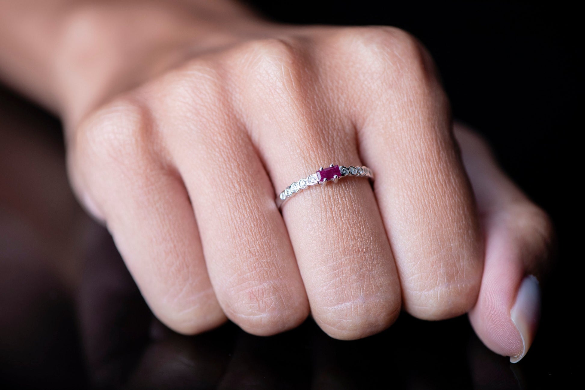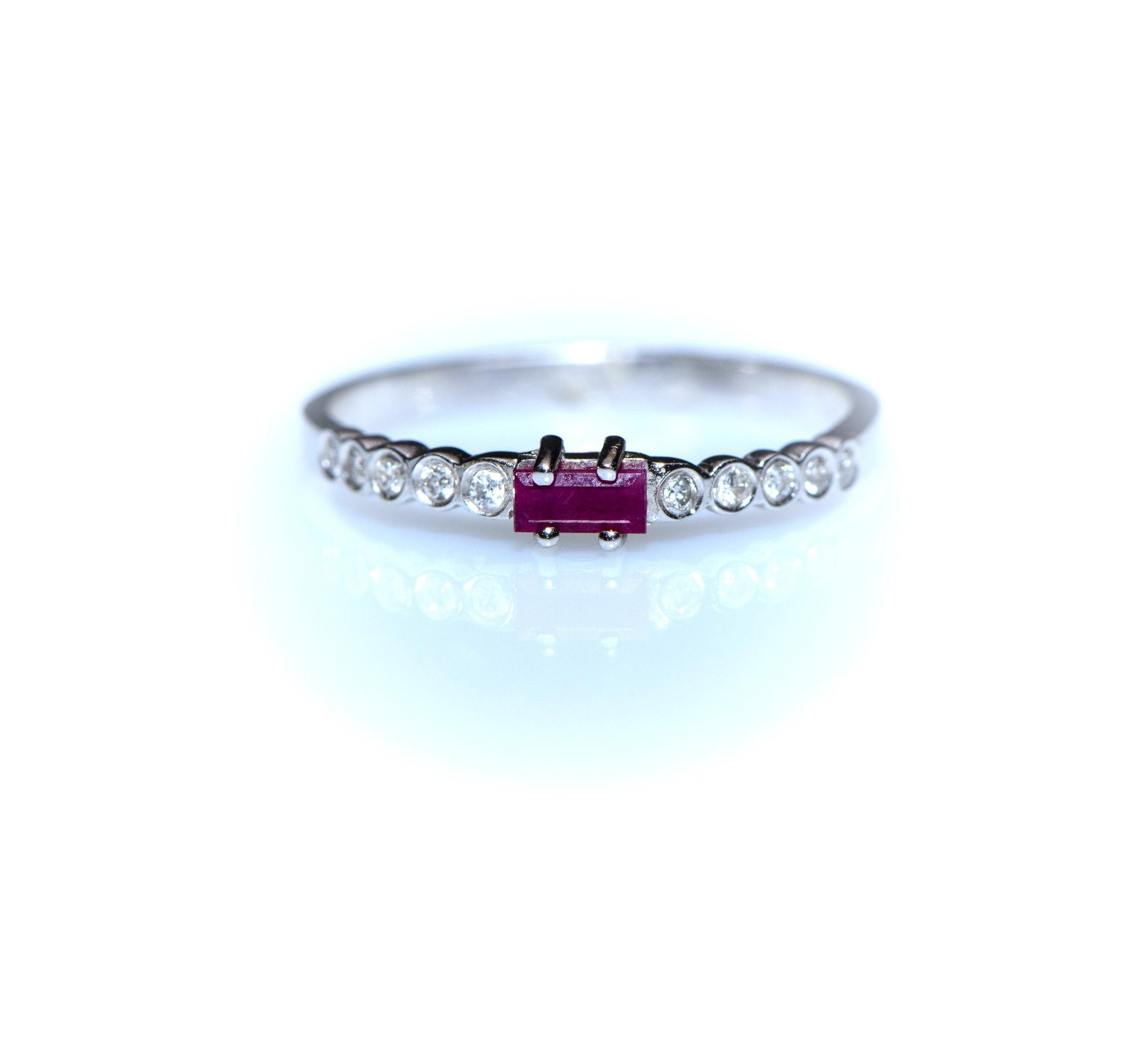 Baguette Ruby and Diamond Ring – 14K White Gold Stacking Band | Delicate Birthstone Ring | Mother’s Day Gift