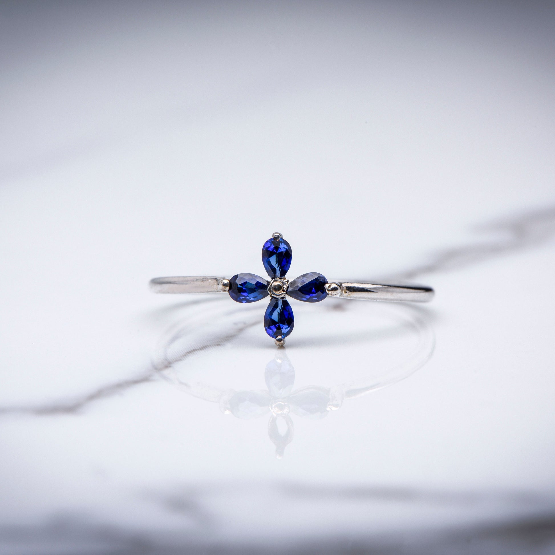 Dainty Sapphire Flower Ring in 14k 8k Gold, Teardrop Cut Blue Gemstone, Delicate Floral Fine Jewelry