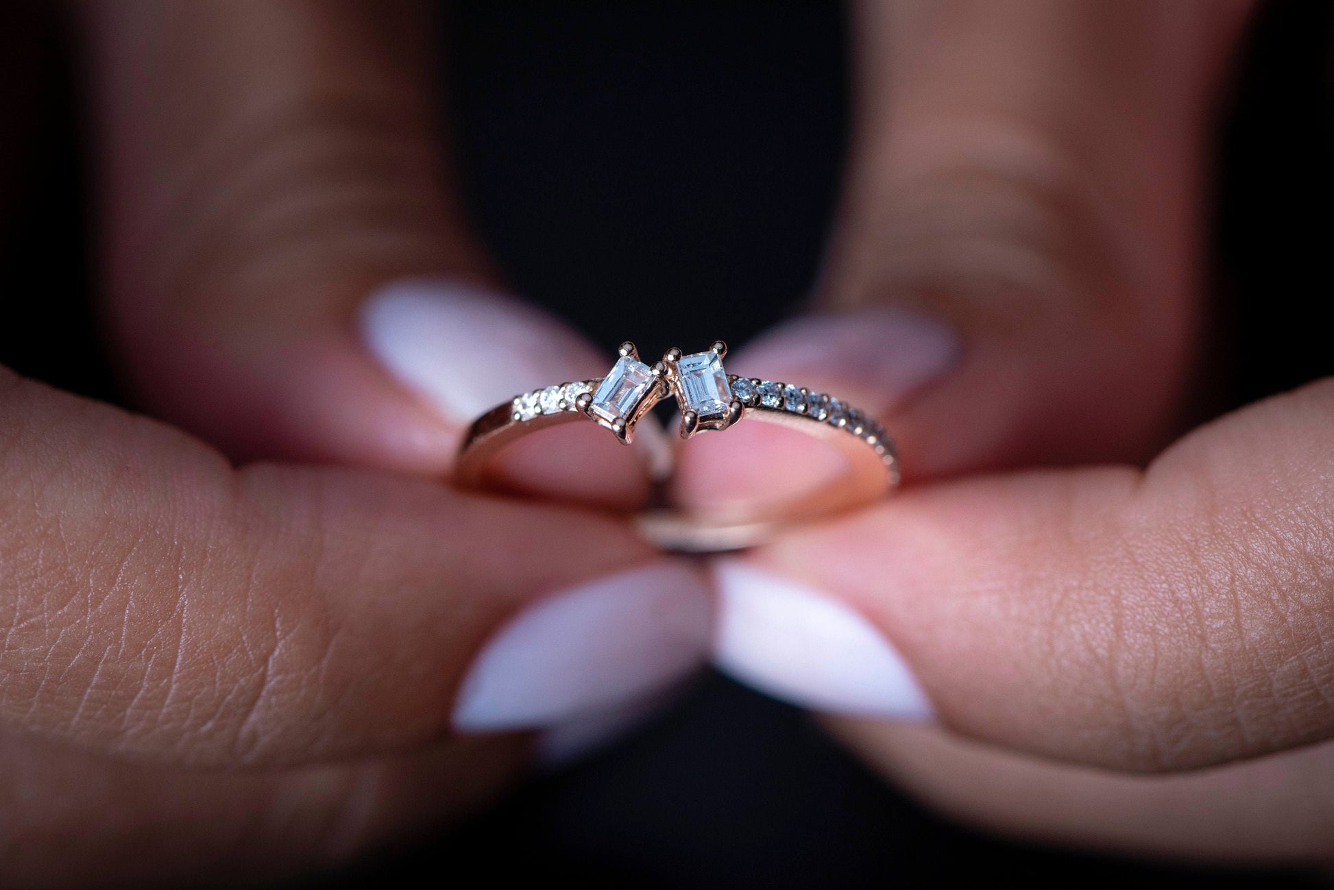 Diamond Ring, Dainty Double Stone Ring, Thin Band Elegant Fine Jewelry Gift