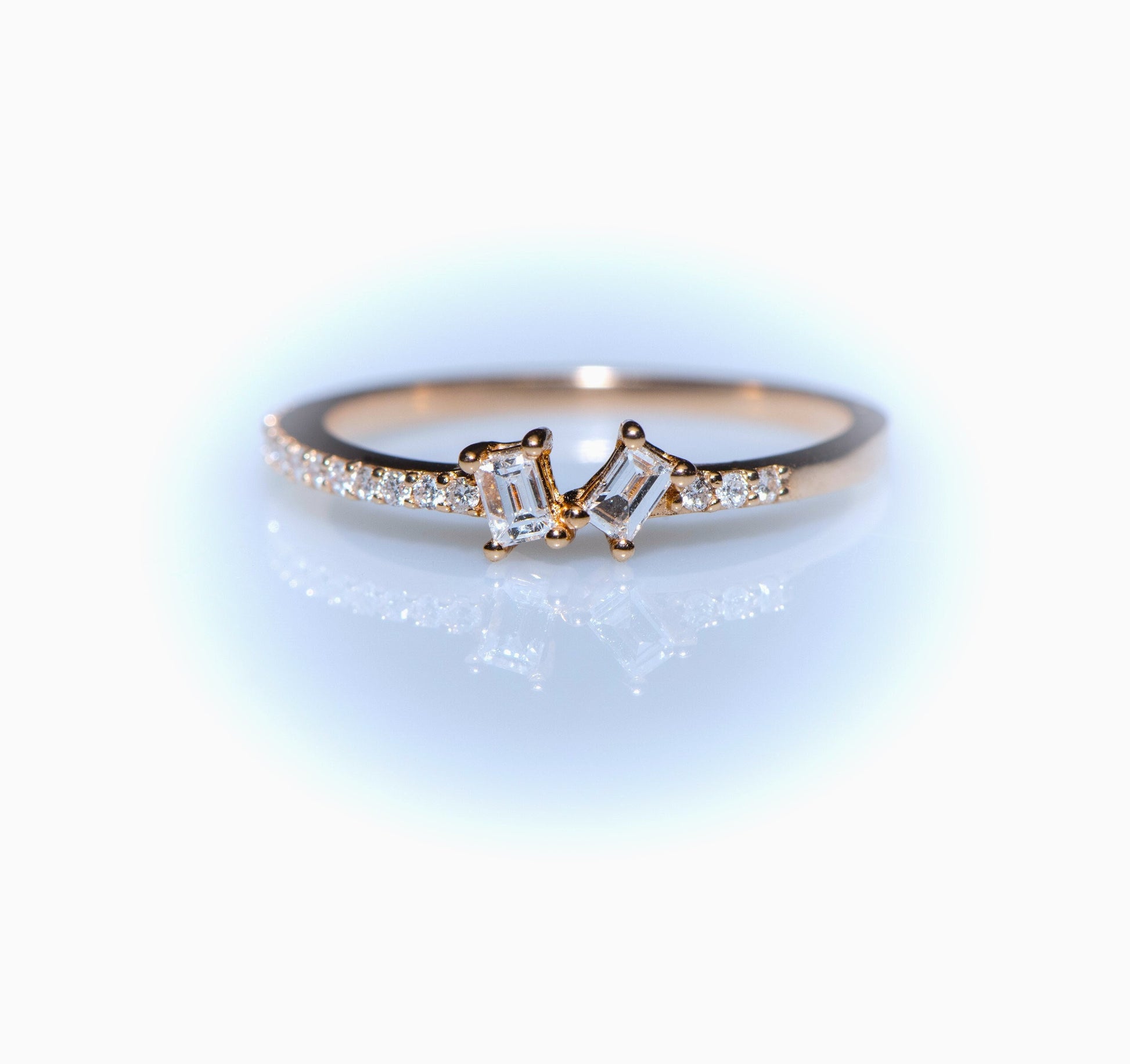 This dazzling 14K rose gold ring features two brilliant baguette-cut diamonds, delicately placed side by side, accented with a row of petite round diamonds along the band. A celebration of symmetry, sparkle, and modern elegance.