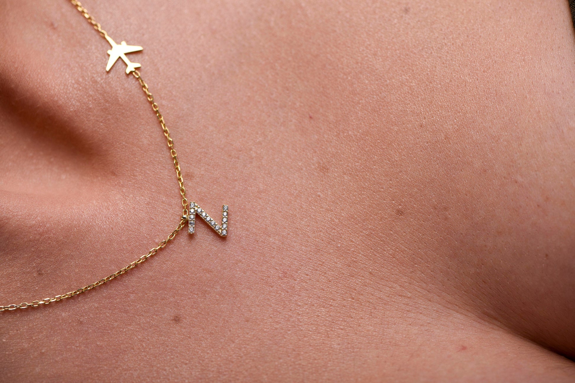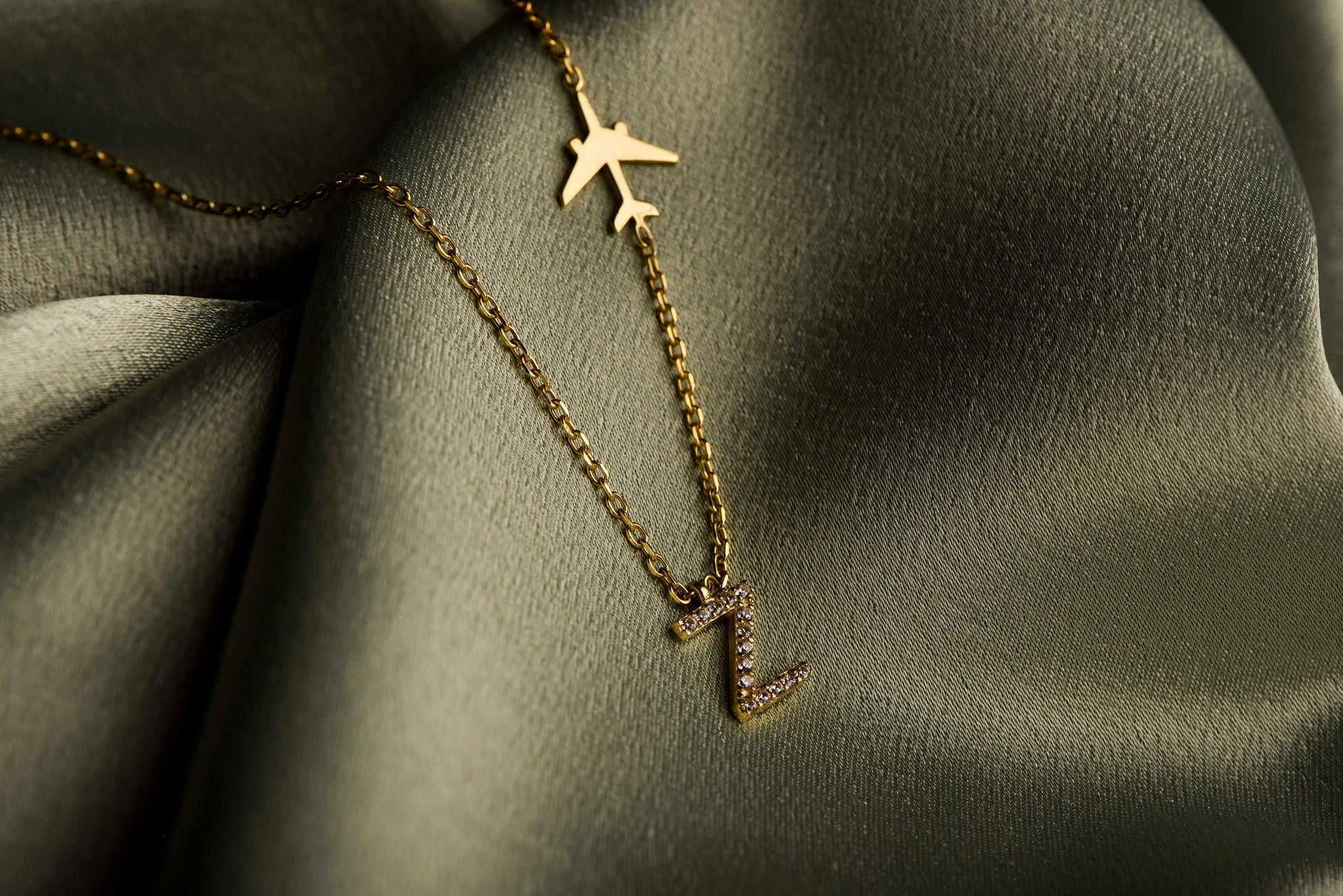 Elegant Solid Gold Airplane Chain Letter Pendant-Unique Aviation Jewelry-Pilot and Stewardess Necklace-Sky Necklace-Christmas Gift Necklace