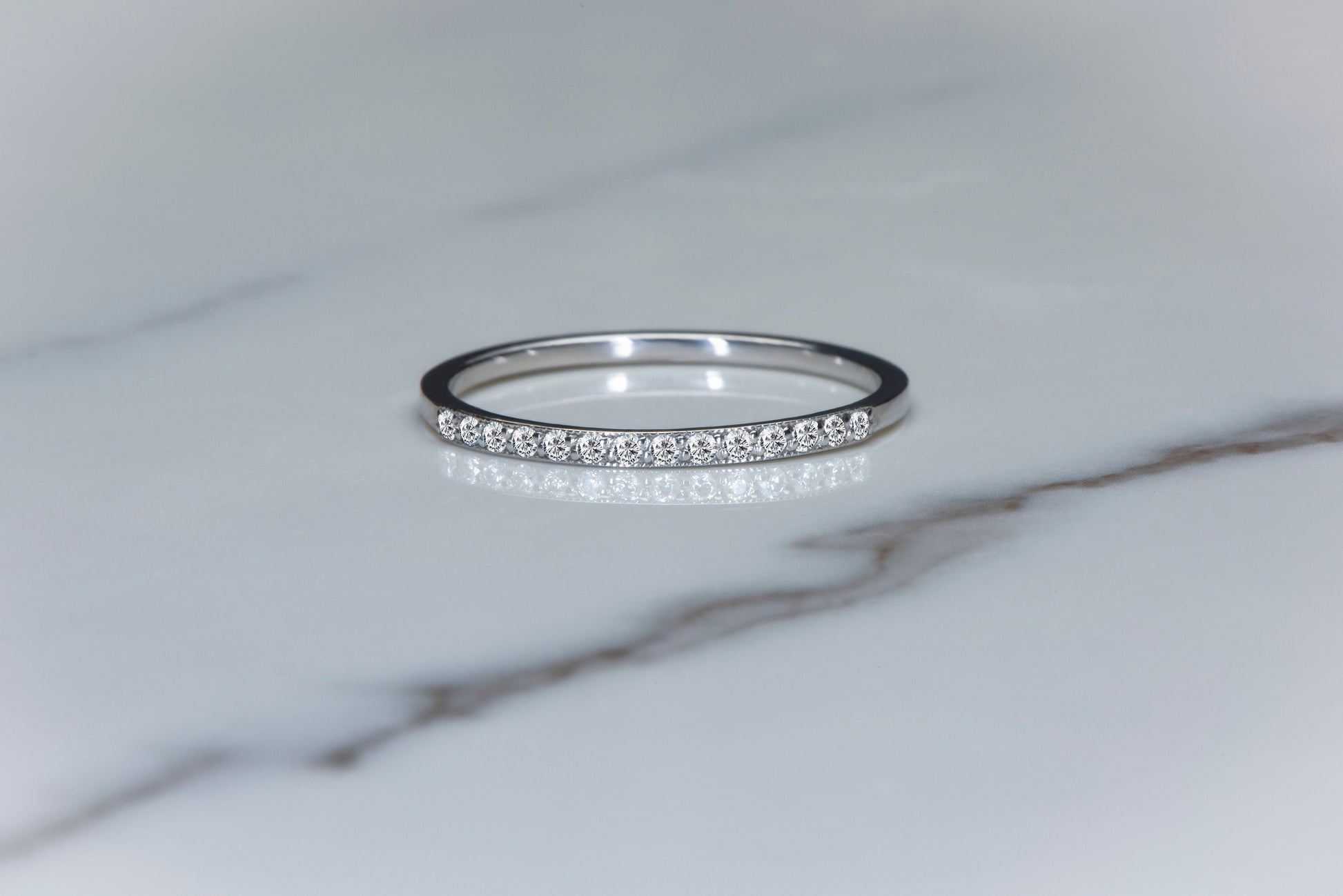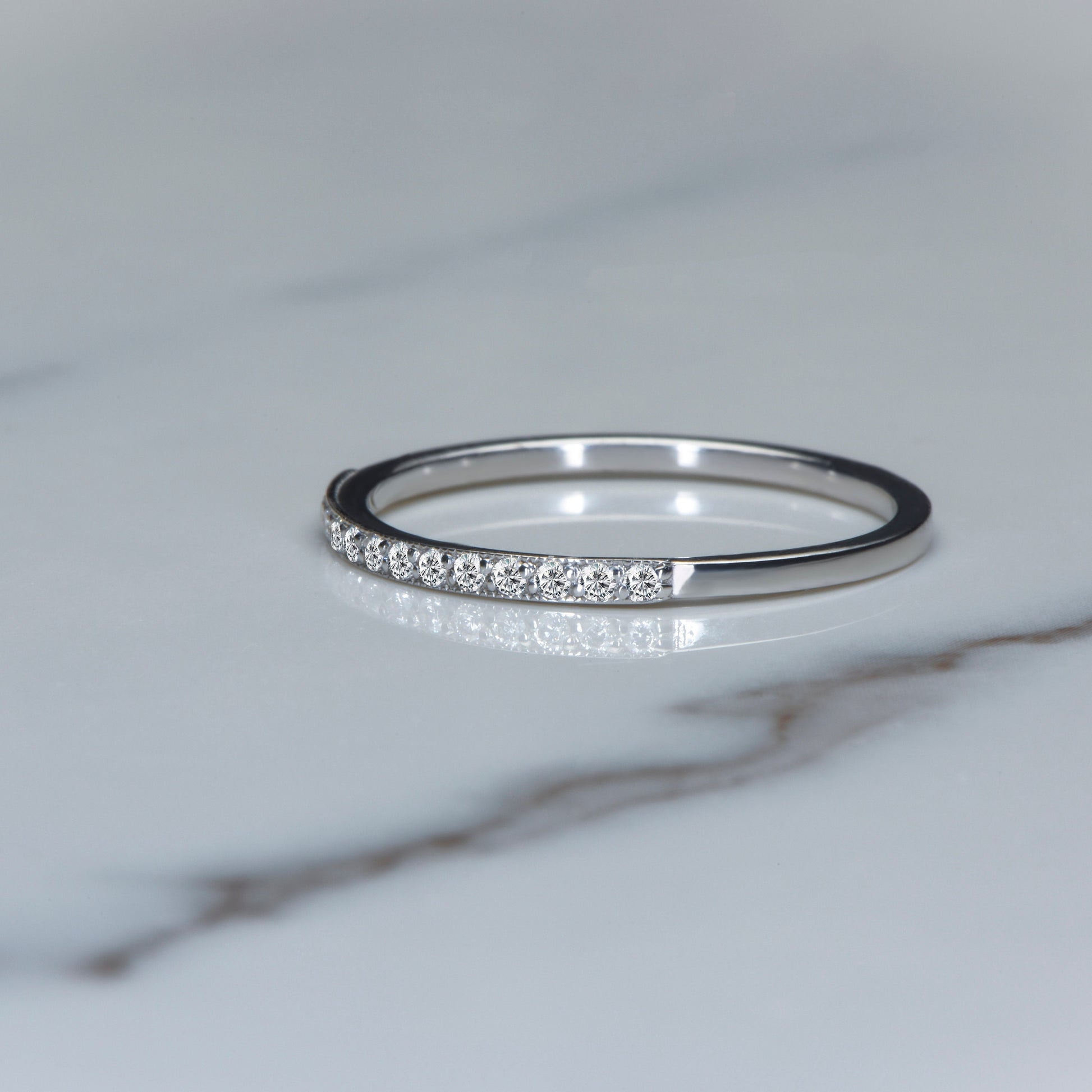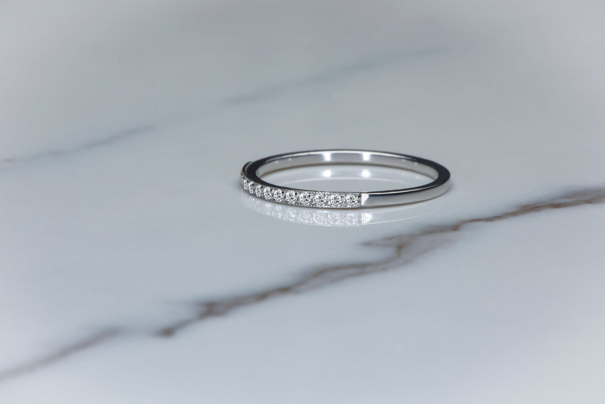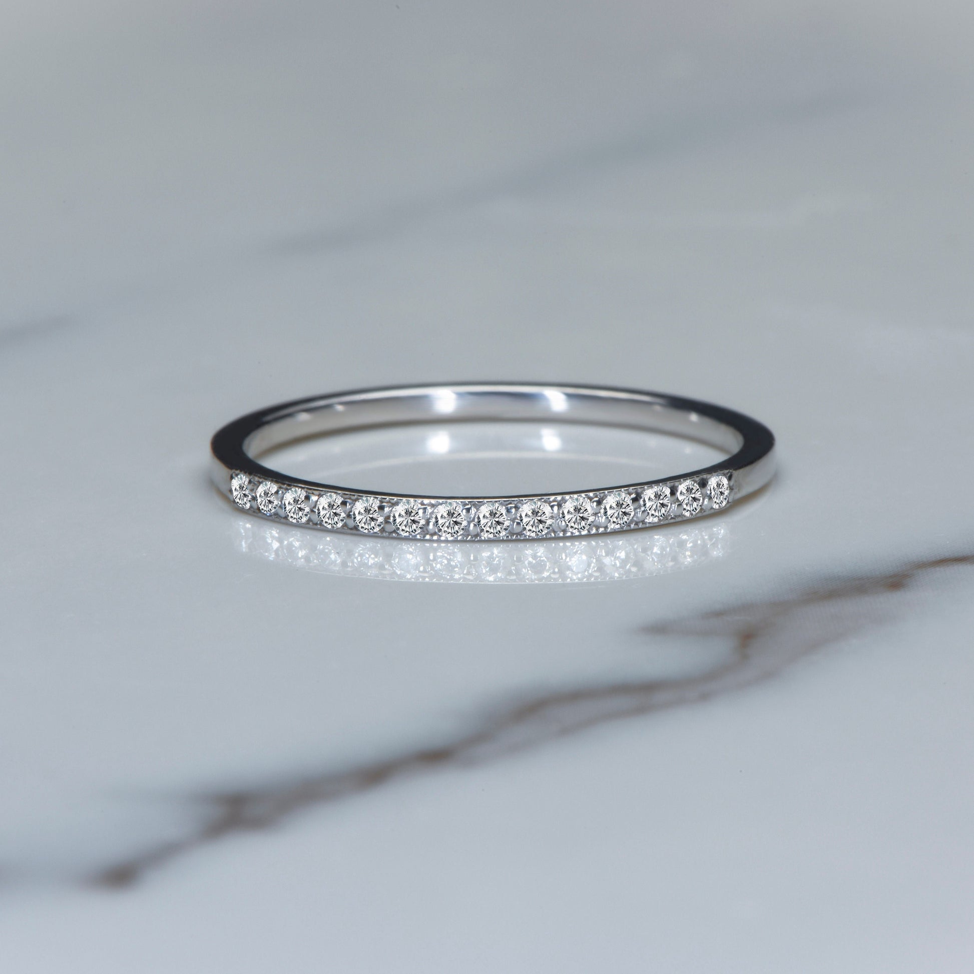 Introducing our exquisite Genuine Diamond Half Eternity Ring, a captivating choice for the modern bride. This dainty diamond wedding band is designed to symbolize endless love and commitment, making it the perfect accessory for your big day. Crafted with precision, this stackable thin gold diamond half eternity matching band showcases a row of sparkling diamonds that radiate elegance and sophistication. Whether worn alone or stacked with other bands, this delicate beauty is sure to add a touch of glamour to any ensemble. Make a lasting impression with this timeless piece, destined to be cherished forever.
