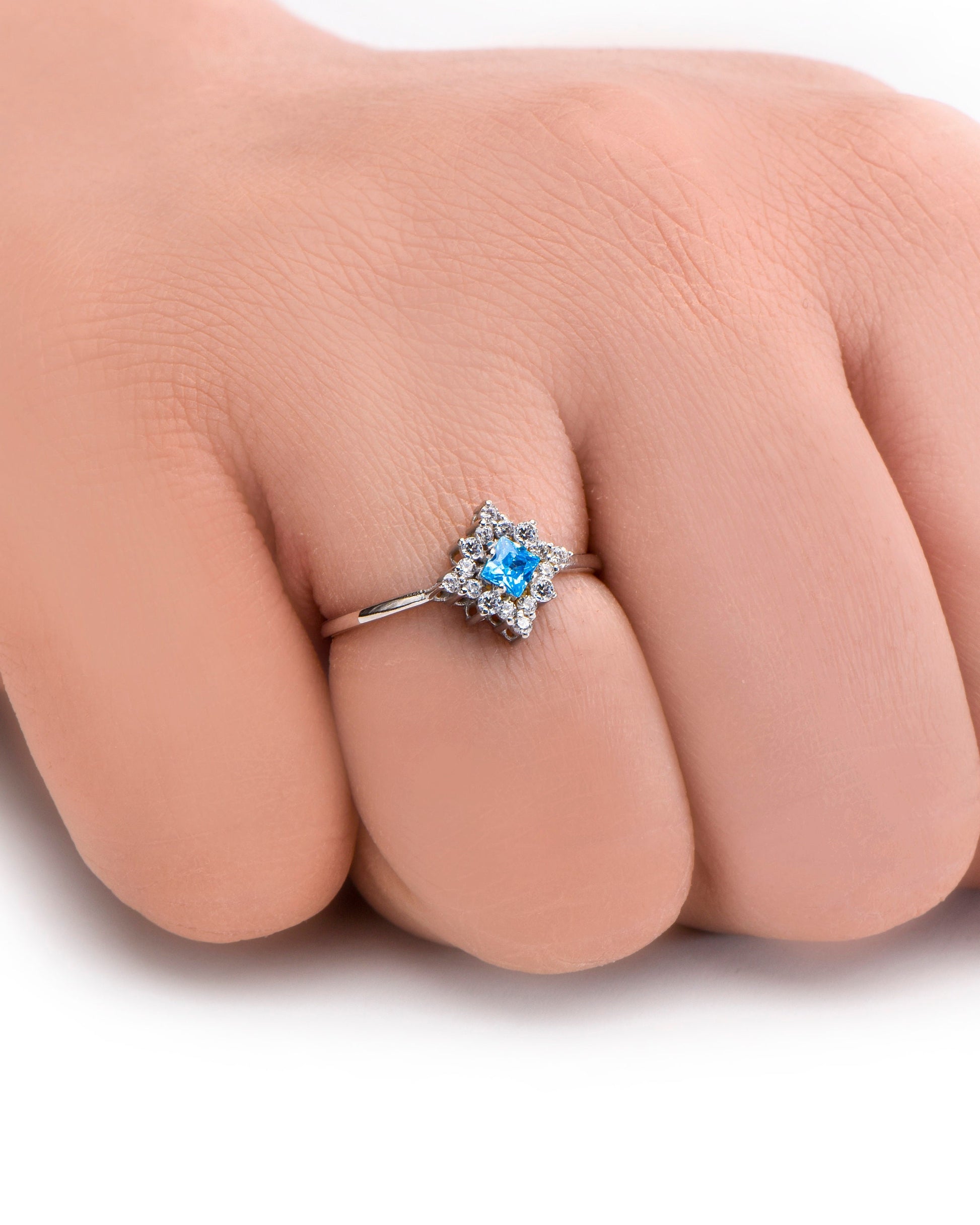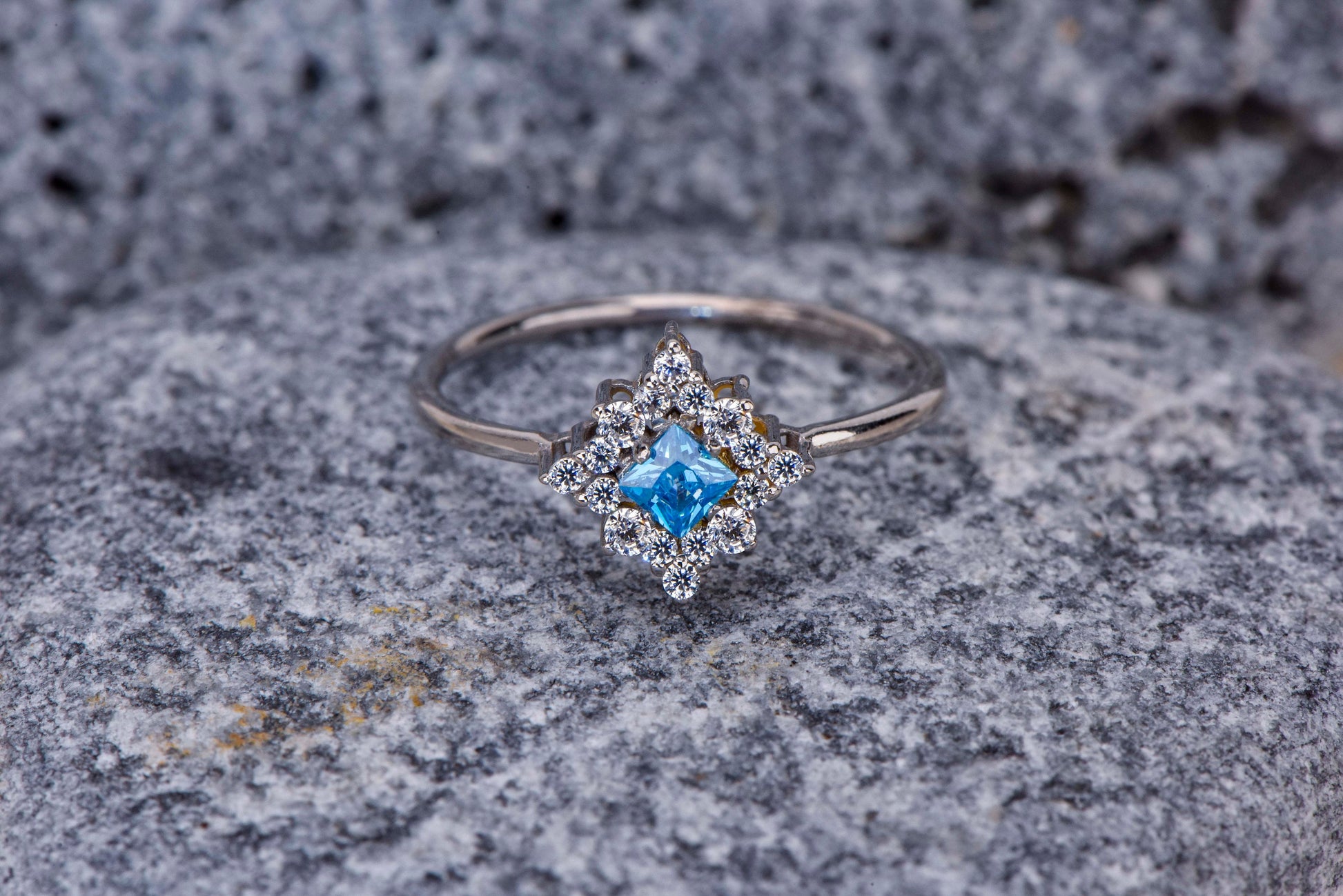 Princess Cut Blue Gemstone Halo Ring – 14K White Gold with Natural Diamonds | Vintage Inspired Handmade Mother’s Day Gift