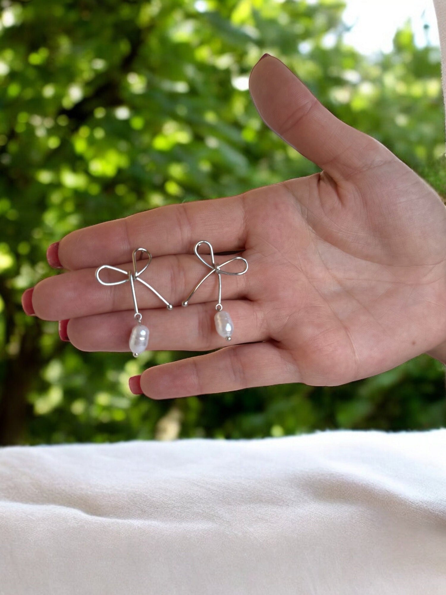 Ribbon Pearl Earrings, Solid Gold Ribbon Pearl Earrings, Pendant Pearl Earrings, Bridal Gift Ribbon Pearl Earrings, Christmas Gift Earrings
