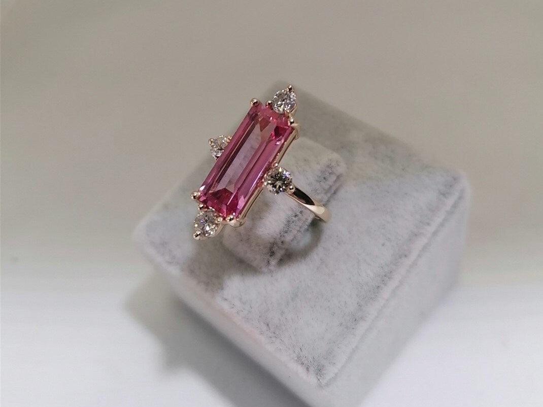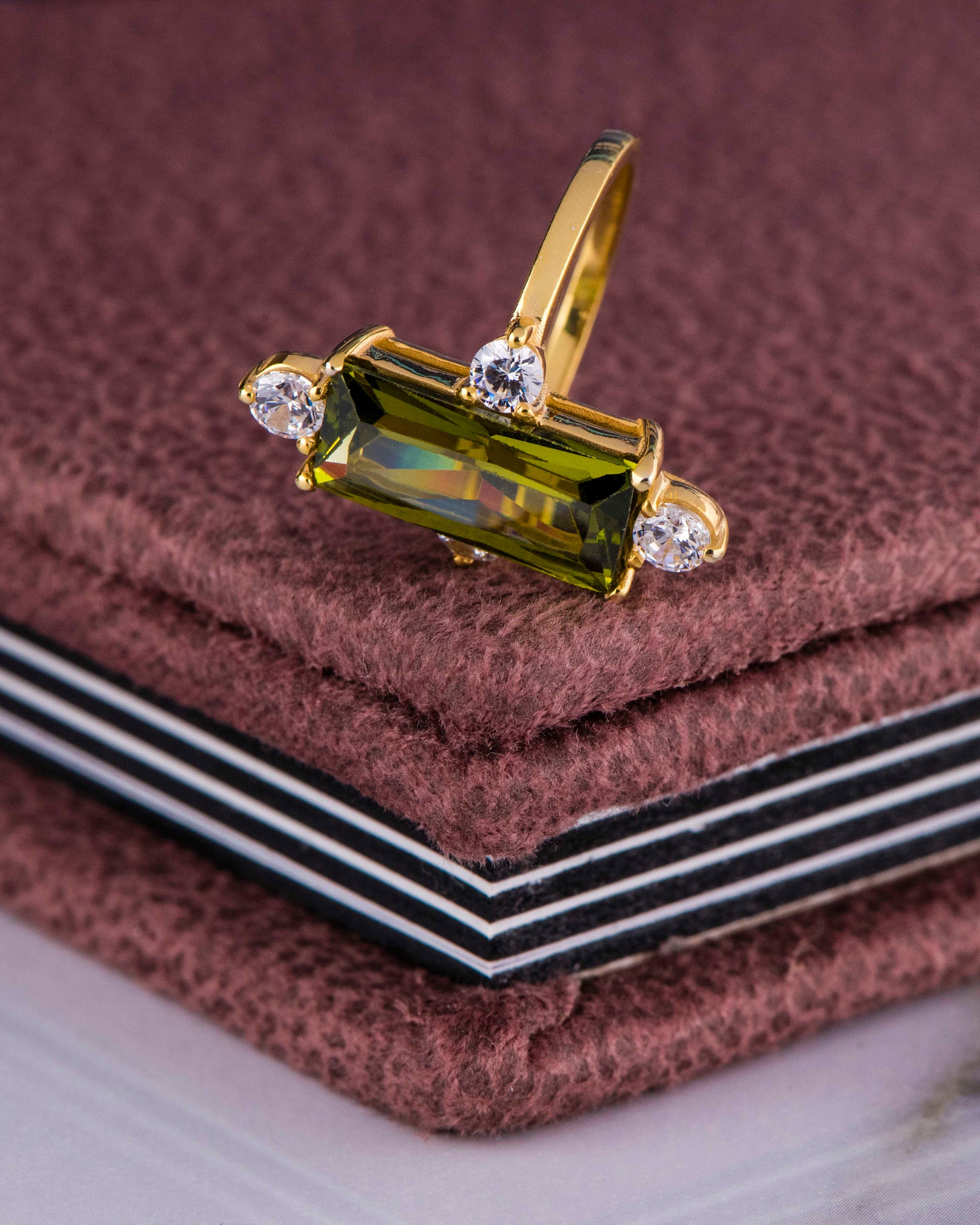 Introducing a ring that commands attention — this statement baguette peridot ring, handcrafted from solid 14k gold, features a striking 14x6mm long baguette-cut peridot in a rich olive green hue. Framed by five brilliant round-cut natural diamonds (0.60ct total), this piece embodies modern sophistication with a luxurious vintage twist.