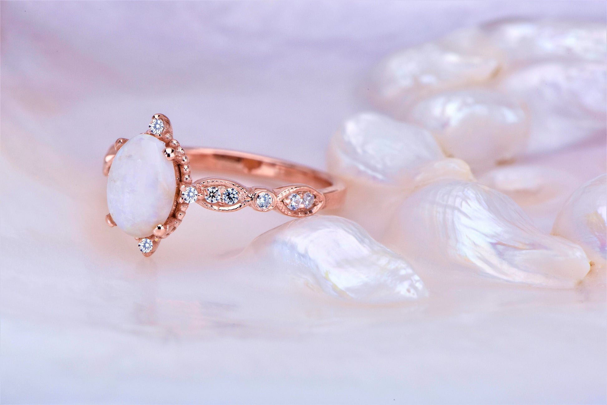 Vintage Opal and Diamond Ring in Solid 14k Gold – Rose Gold Oval Engagement Ring – October Birthstone Gift for Her