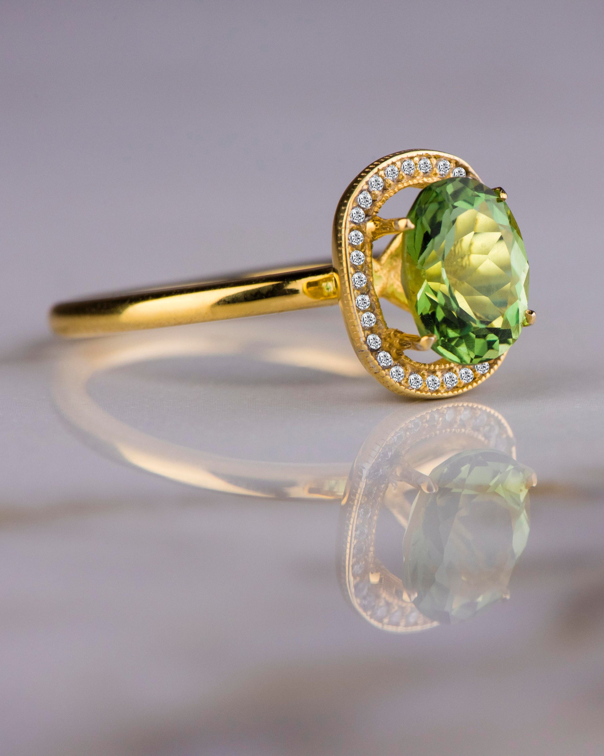 Vintage Oval Cut Peridot and Diamond Ring in 14k Solid Gold – August Birthstone Halo Ring for Her