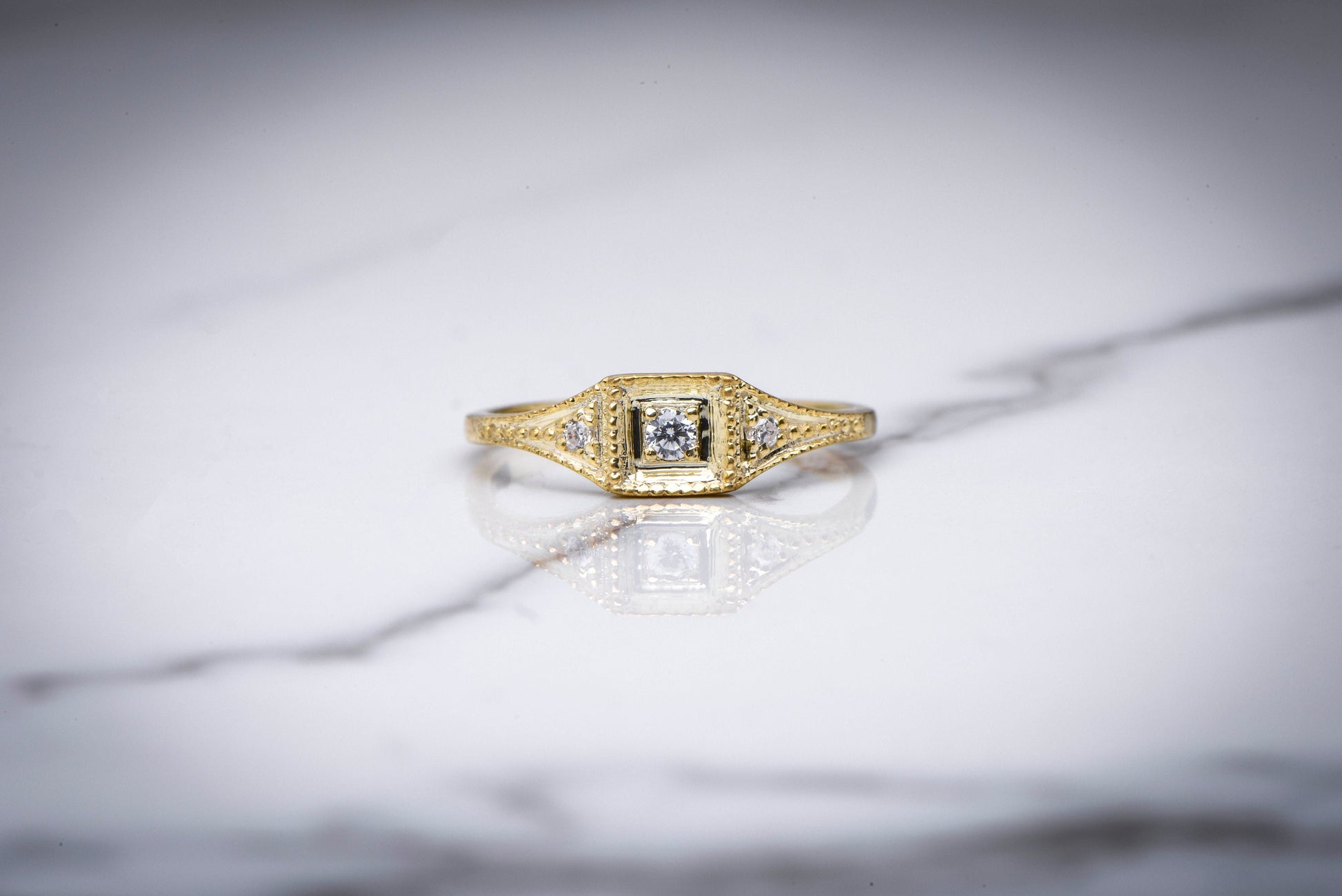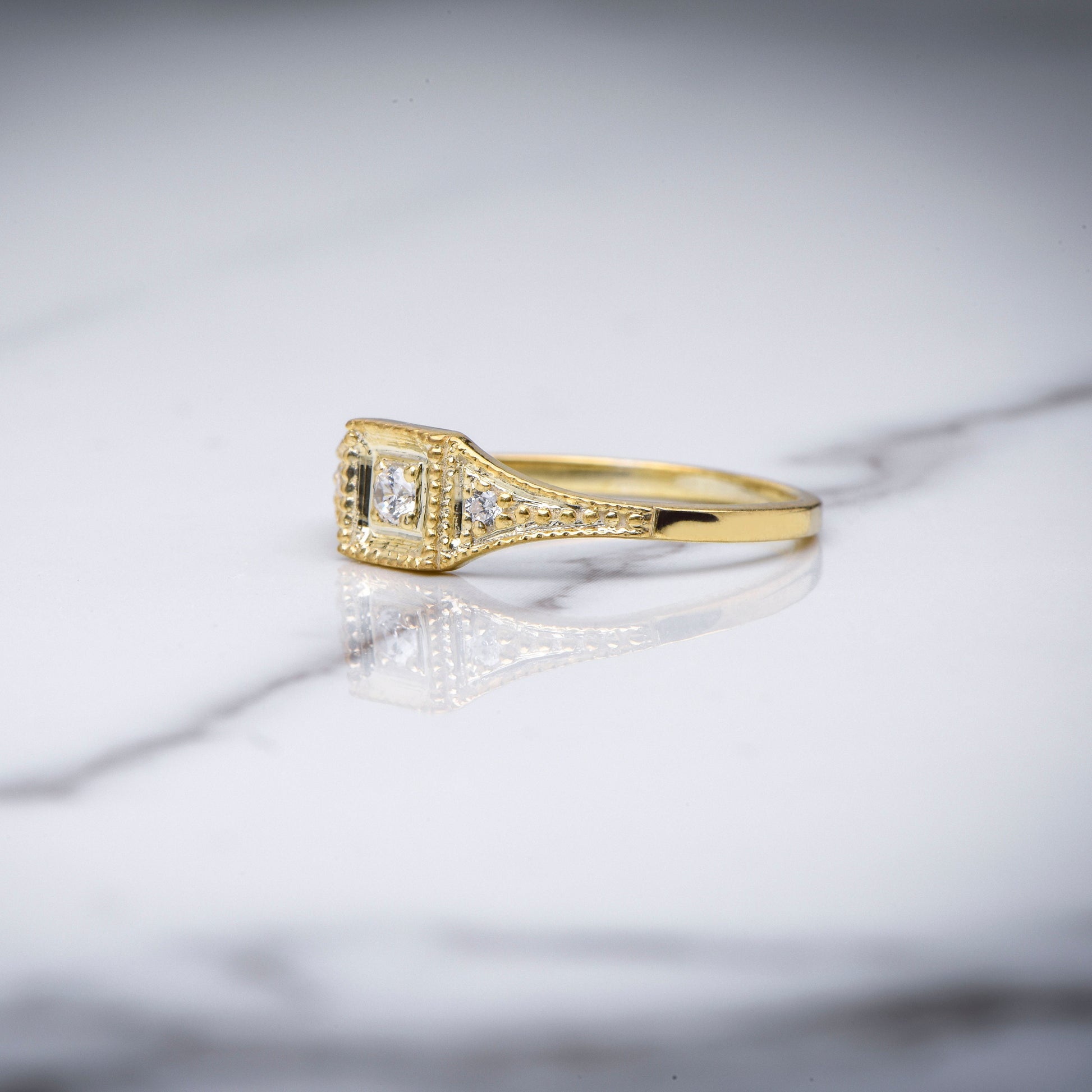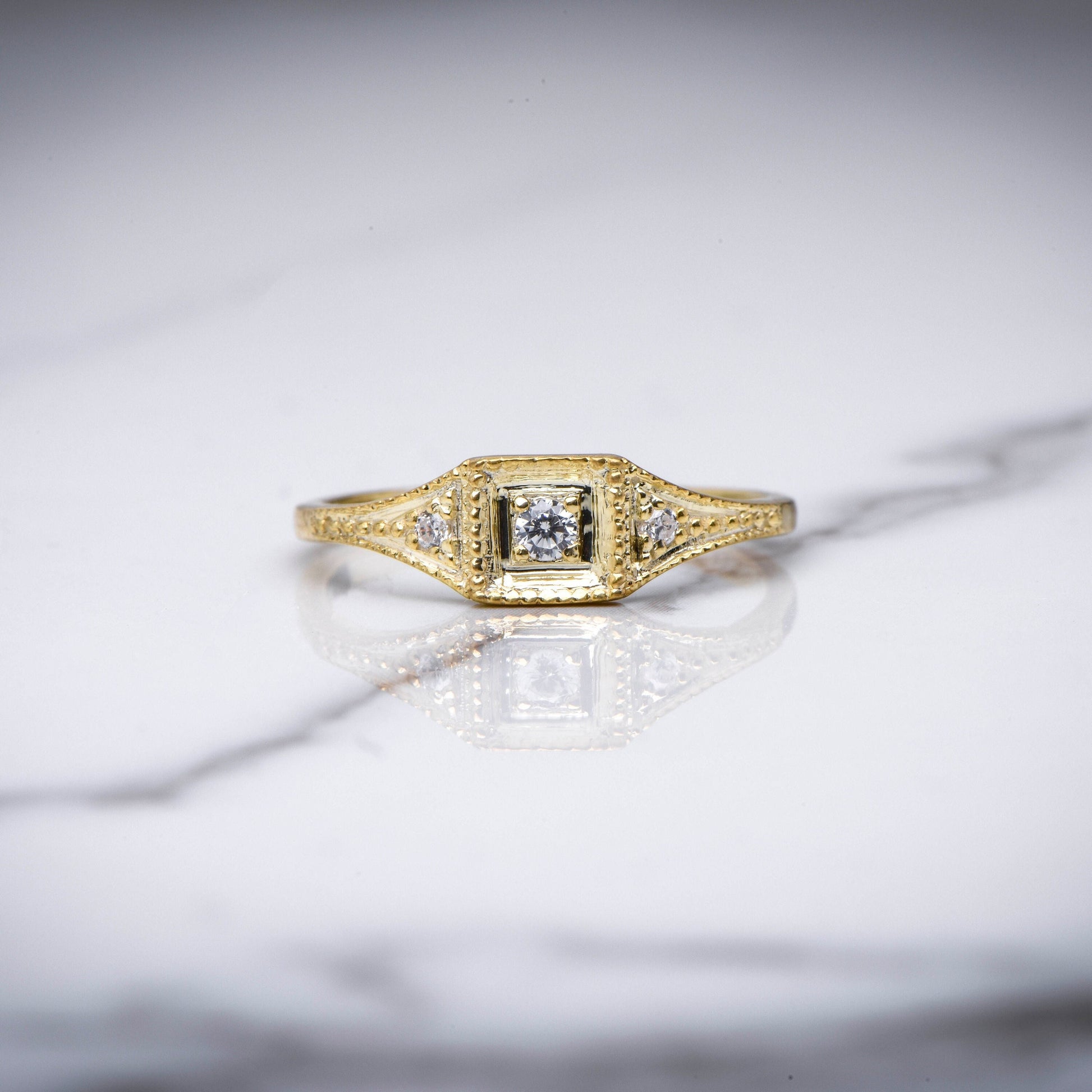 Capture the essence of old-world romance with this beautifully detailed 14K gold engagement ring. The square bezel-set center diamond is framed with delicate milgrain and flanked by two sparkling side stones — offering a look that feels both heirloom and contemporary.