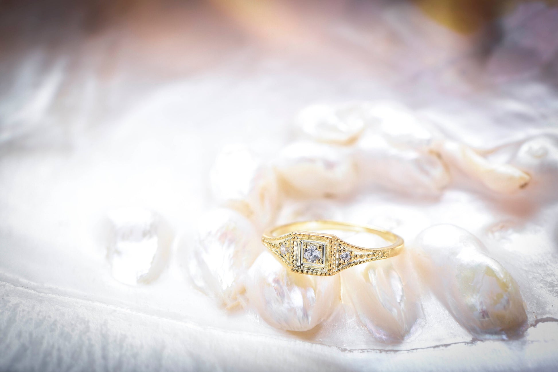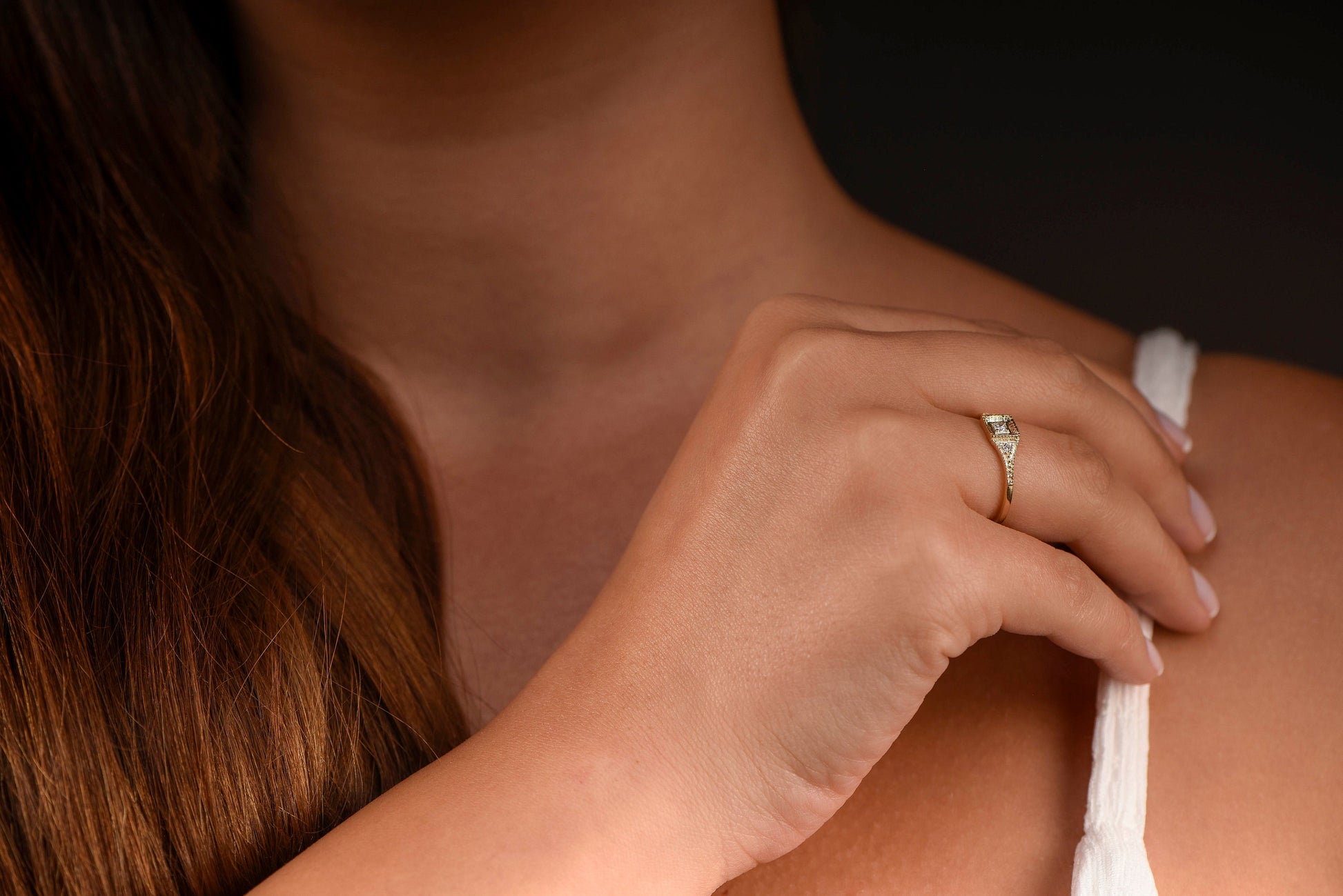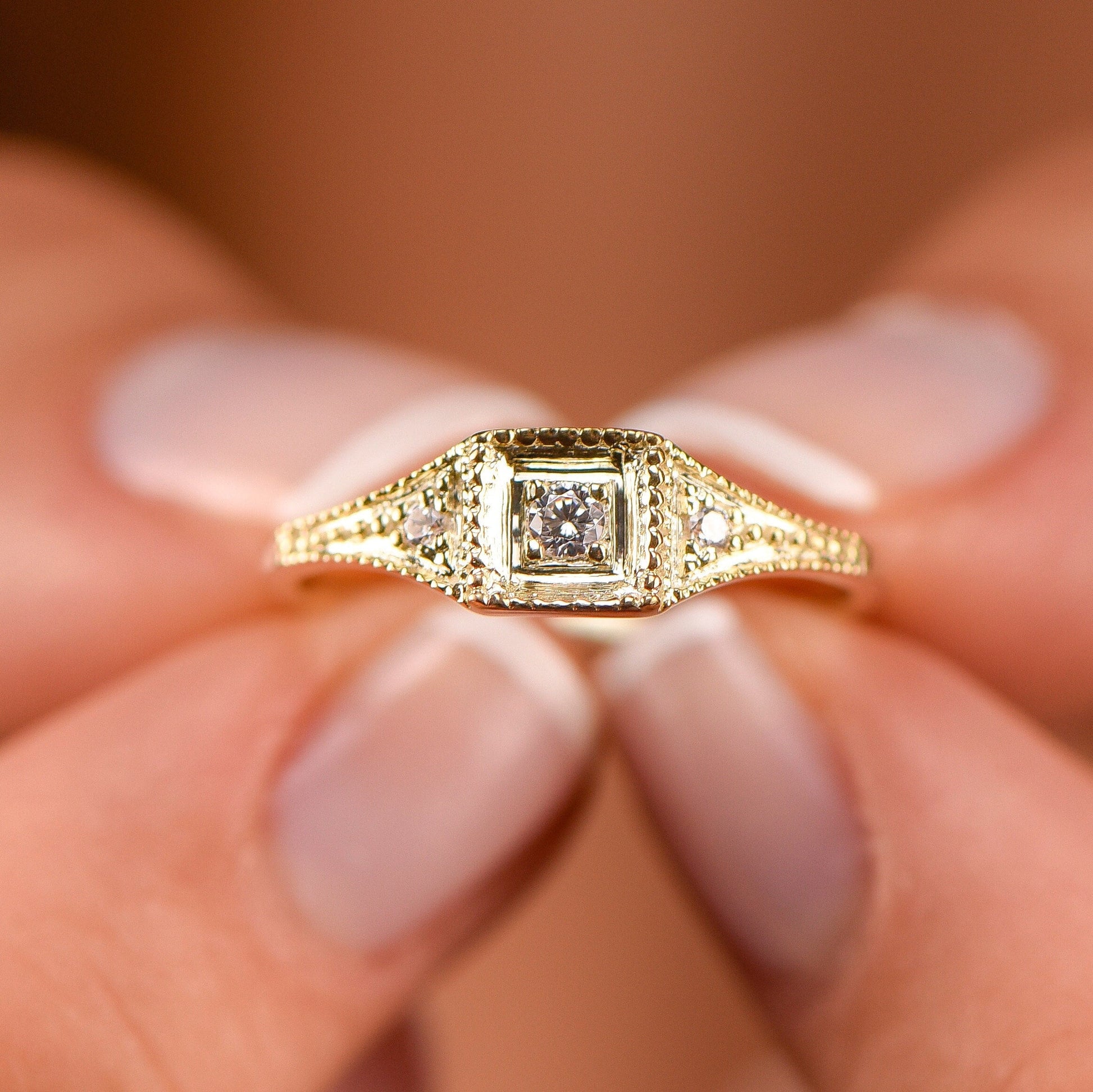 Capture the essence of old-world romance with this beautifully detailed 14K gold engagement ring. The square bezel-set center diamond is framed with delicate milgrain and flanked by two sparkling side stones — offering a look that feels both heirloom and contemporary.