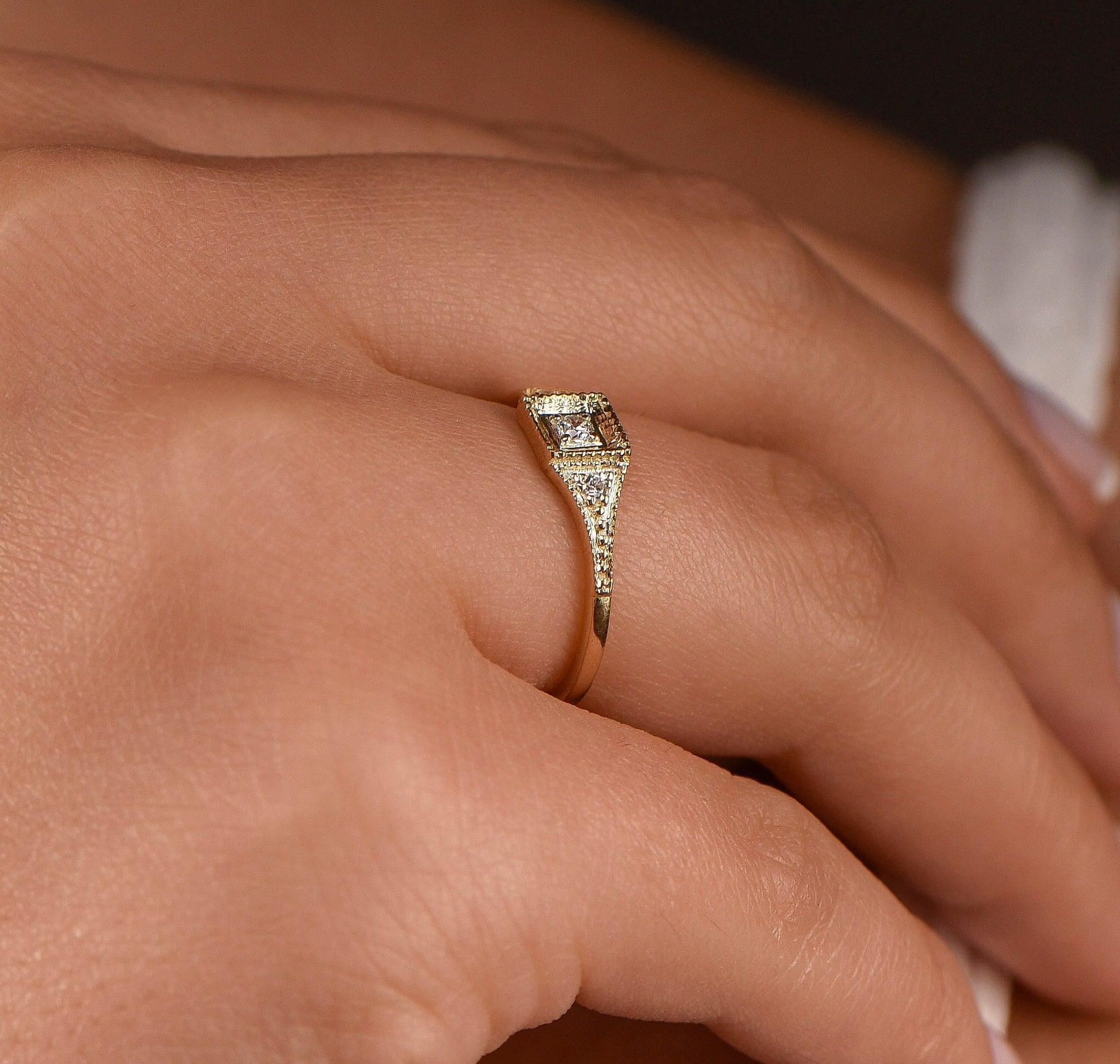 Vintage Style Diamond Engagement Ring in 14K Gold, Square Bezel Set Ring with Accent Stones, Elegant Thin Band Ring